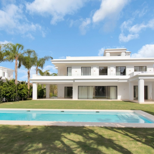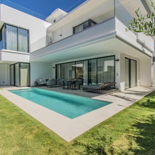 Situated in a prestigious beachfront urbanization, these villas enjoy a prime location on Marbella's Golden Mile, with direct access to the beach and a wide range of services and exclusive dining options. With a modernist design that combines glass, concrete, and wood, these four- and five-bedroom residences seamlessly integrate with nature through wooden facades and botanical living walls. Inside, luxury is evident in every corner: a five-star spa, state-of-the-art home automation, and the use of exquisite materials such as Negro Marquina marble and natural stone—all designed with the utmost respect for the environment.