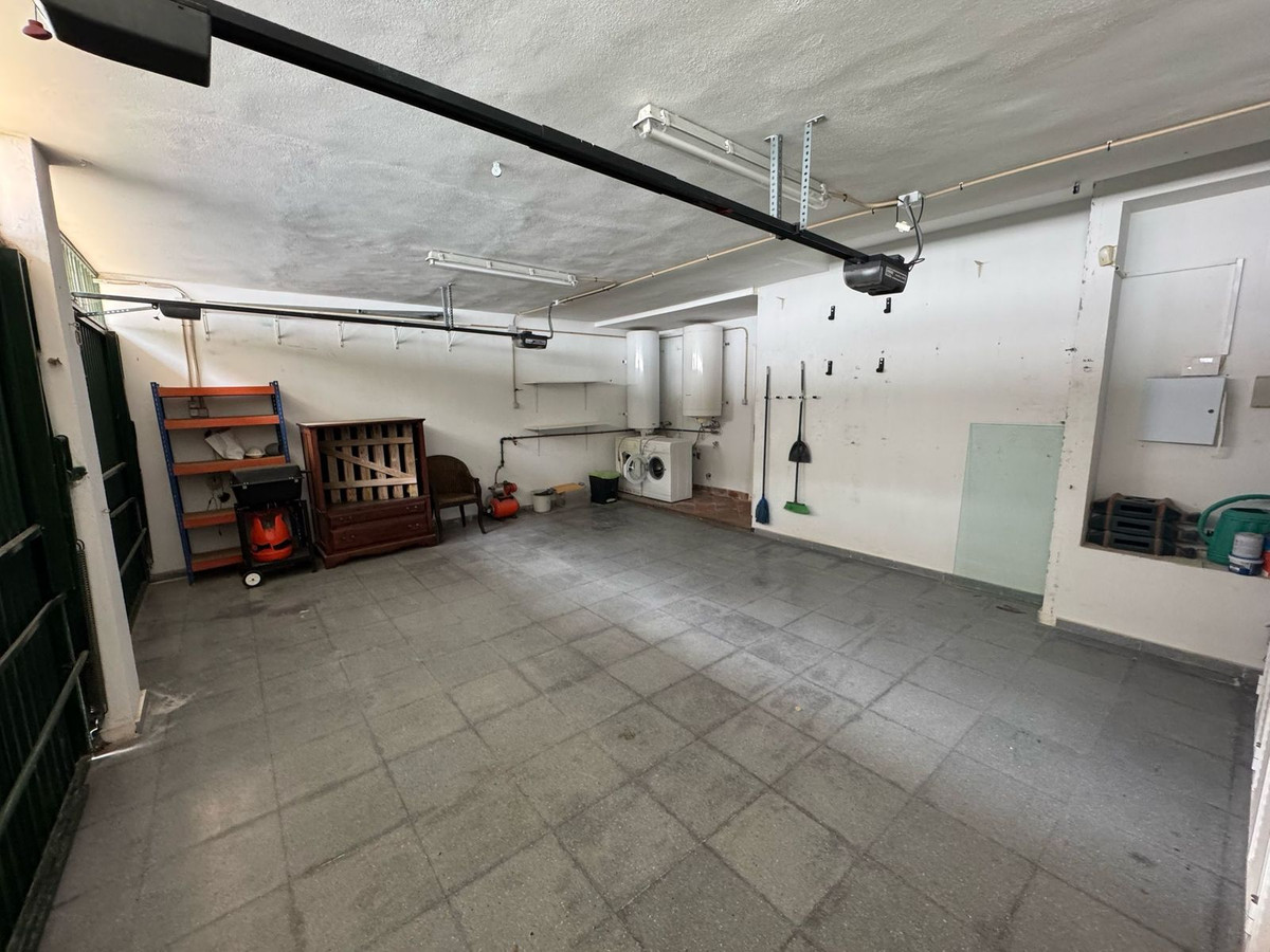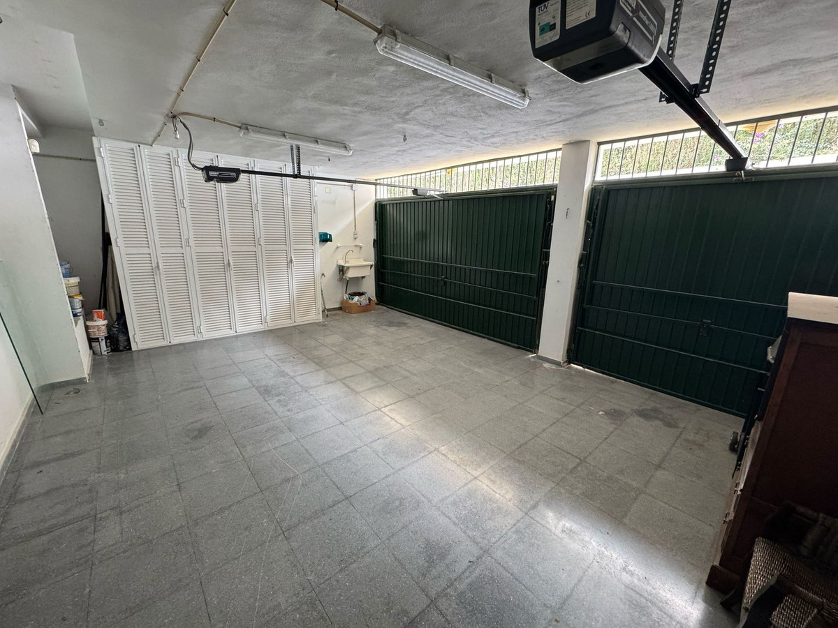 The lower level houses the master suite with direct access to a private garden, along with two guest bedrooms and a private double garage. Additional features include a fully fitted kitchen, guest toilet, hot and cold air conditioning, electric shutters, and fitted wardrobes. This property presents an excellent renovation opportunity in a peaceful yet well-connected residential community.