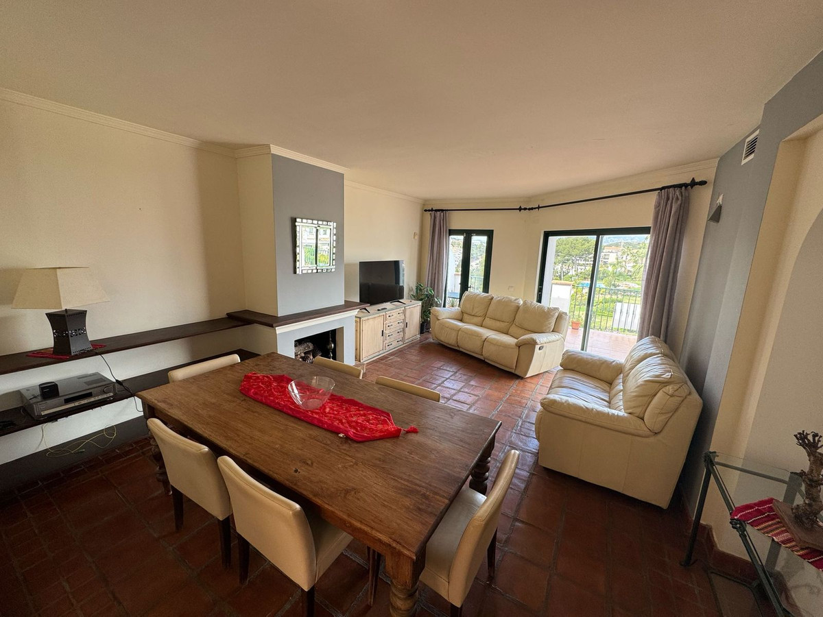 The community boasts beautifully maintained gardens, two communal swimming pools—including a heated one—ensuring year-round enjoyment. Inside, the property features a bright, open-plan living and dining area with a cozy built-in fireplace, leading to a spacious terrace with stunning views of the mountains, golf course, and pool.