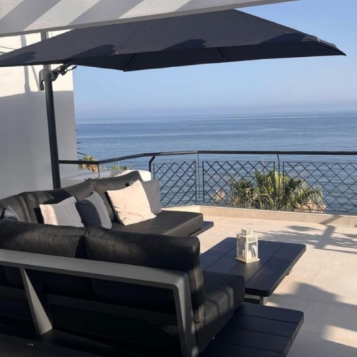 This contemporary penthouse in Mijas, Málaga, offers a harmonious blend of comfort and style. It is located directly on a golf course and offers an impressive view of the sea, so you can enjoy both the tranquillity of the green and the panorama of the coast. The open-plan living area features floor-to-ceiling windows that flood the space with natural light and provide stunning panoramic views of the surrounding landscape. The living room is tastefully furnished with a plush white sectional sofa, accented by vibrant area rugs that add warmth to the polished floors. The sleek kitchen boasts modern navy cabinetry contrasted with white countertops and high-end stainless steel appliances, creating a sophisticated culinary space. The penthouse's three bathrooms are elegantly appointed, with one showcasing a floating double vanity in rich wood tones and a glass-enclosed shower. The primary bedroom is a serene retreat with direct access to a private terrace. It features a canopied bed, a spacious walk-in closet, and a luxurious en-suite bathroom with both a bathtub and a shower. The second bedroom offers equally impressive views and is furnished with a comfortable double bed. A dedicated office space provides a functional work area with a modern desk setup and ample natural light. The crowning feature of this property is the private terrace, complete with a swimming pool and expansive views of the surrounding hills and greenery. Additionally, the penthouse includes two parking spaces and two storage rooms. Residents also have access to excellent communal amenities, including a large swimming pool, a heated pool, and an outdoor kitchen that can be used by everyone. With its thoughtful layout, luxurious amenities, and prime location in Urbanización Cerrado del Águila, this penthouse offers a perfect balance of indoor comfort and outdoor living in the heart of Costa del Sol. We are pleased to be able to present this dream property to you soon, either personally or via virtual viewing. Because this world is unique - just like our Axarquía. In Andalusia. On the Costa del Sol. Here, on the sunny side of life...