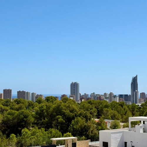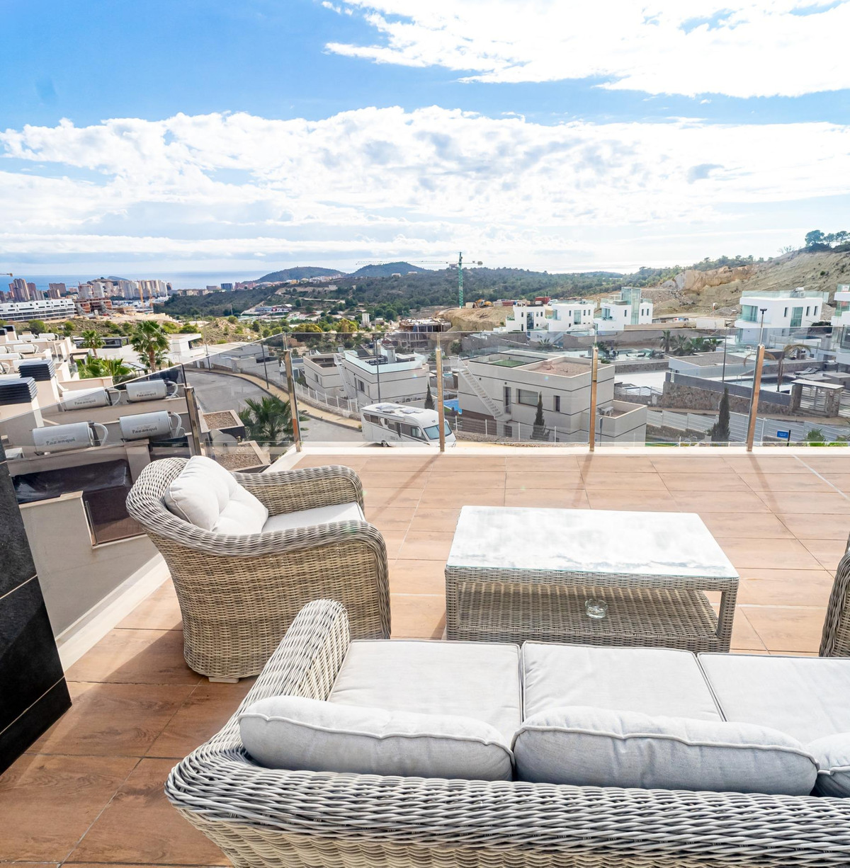Detta hörnvåning ligger i det nya området i Finestrat. Lägenheten har gott om naturligt ljus och är i mycket gott skick. Den har 3 sovrum, varav ett har en liten balkong. Båda badrummen har golvvärme, och ett av dem är en-suite. Köket är öppen planlösning, och från vardagsrummet kan man gå ut till en balkong med ett förråd och sedan uppför en trappa till en stor terrass på mer än 90 m². Terrassen har sol hela dagen, med belysning och med instalerat vatten, ett förråd för tvättmaskinen och imponerande bergs- och havsutsikt. Vattnet värms upp med solpaneler och lägenheten har luftkonditionering för både kyla och värme. En parkeringsplats ingår i priset och ligger framför byggnaden som har bara två lägenheter.