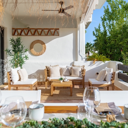 Ground Floor Apartment for sale in Benatalaya, Estepona with 2 bedrooms and 2 bathrooms, with communal swimming pool, private garage (2 parking spaces) and private garden. Regarding property dimensions, it has 112 m² built and 66 m² plot. Has the following facilities air conditioning, fully fitted kitchen, utility room, marble floors, sauna, gym, security entrance, security service 24h, private terrace, kitchen equipped, living room, mountain view, indoor pool, laundry room, internet - wi-fi, 24h service, gated community, lift, garden view, doorman, glass doors, wheelchair-accessible, recently renovated / refurbished, close to shops, close to town, close to schools, surveillance cameras and pets allowed.