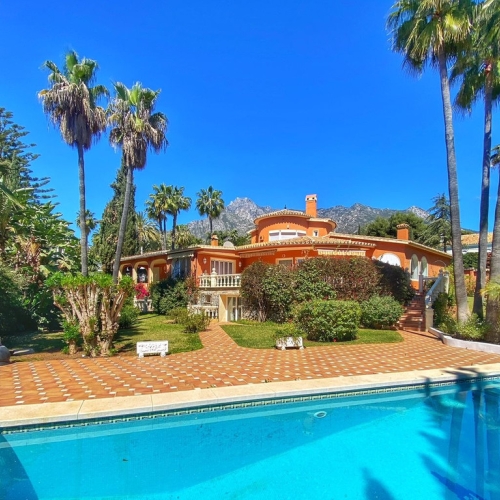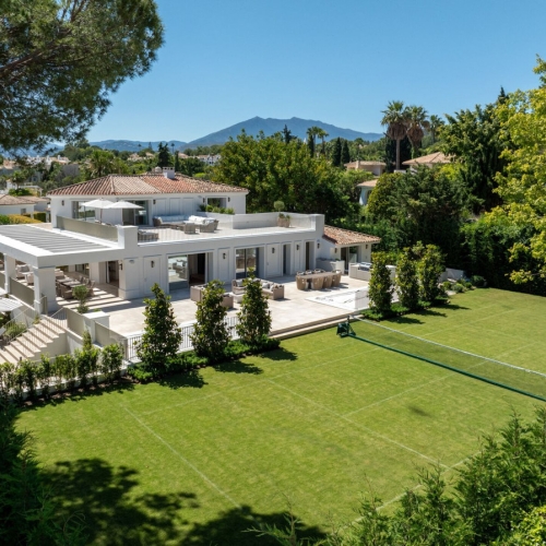 Casa Castaña is an exquisite luxury villa nestled in an exclusive gated community in Marbella, offering breathtaking views of the Sierra Blanca mountains and the Mediterranean Sea. Just a short drive from Marbella's top amenities, including prestigious golf courses, international schools, and high-end shopping, this villa combines privacy and convenience with easy access to Malaga airport.