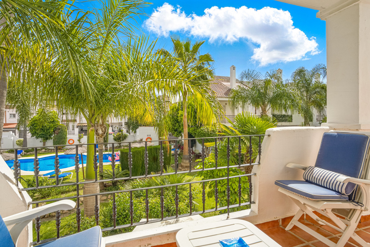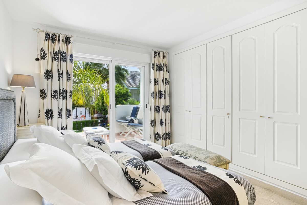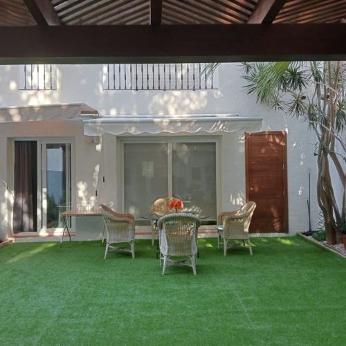 Beläget i den prestigefyllda gemenskapen Los Naranjos de Marbella, erbjuder detta rymliga halvt fristående hus en privilegierad miljö med anlagda trädgårdar, gemensam pool och en Mercadona stormarknad. Inom gångavstånd från Puerto Banus och bara några minuters bilresa från centrum av Marbella, kombinerar detta hus komfort och exklusivitet. Huset har en utmärkt öst-västlig orientering, vilket möjliggör naturligt ljus hela dagen, och erbjuder fantastisk utsikt över poolen, trädgårdarna och bergen. På bottenvåningen hittar vi ett rymligt och ljust kök med tillgång till verktygsrummet. Det rymliga vardagsrummet, med stora fönster, öppnar för en charmig terrass idealisk för att njuta av Medelhavsklimatet. På första våningen är sovrummet en svit med privat terrass, tillsammans med två gäst sovrum som delar ett badrum. Ett av dessa sovrum har också tillgång till terrassen. Den andra våningen har ett solarium, perfekt för att koppla av och njuta av panoramautsikten. Dessutom finns det möjlighet att skapa ett extra sovrum helt enkelt genom att ta bort en partition. Bland dess funktioner är de inbyggda garderoberna, kall / varm luftkonditionering, marmorgolv och ett utomhus garageutrymme inuti fastigheten. Till skillnad från många radhus delar den bara en vägg med grannen och njuter därmed av större integritet. En unik möjlighet att leva i en exklusiv miljö, med alla bekvämligheter i dina fingertoppar.