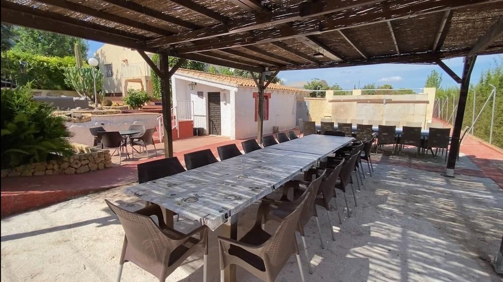 Denna fastighet har flera områden och byggnader och erbjuder stora möjligheter. Huvudbyggnaden är uppdelad i flera sovrum, badrum, ett rymligt kök och ett vardagsrum/matrum med kamin. På denna våning finns också en stor täckt terrass.