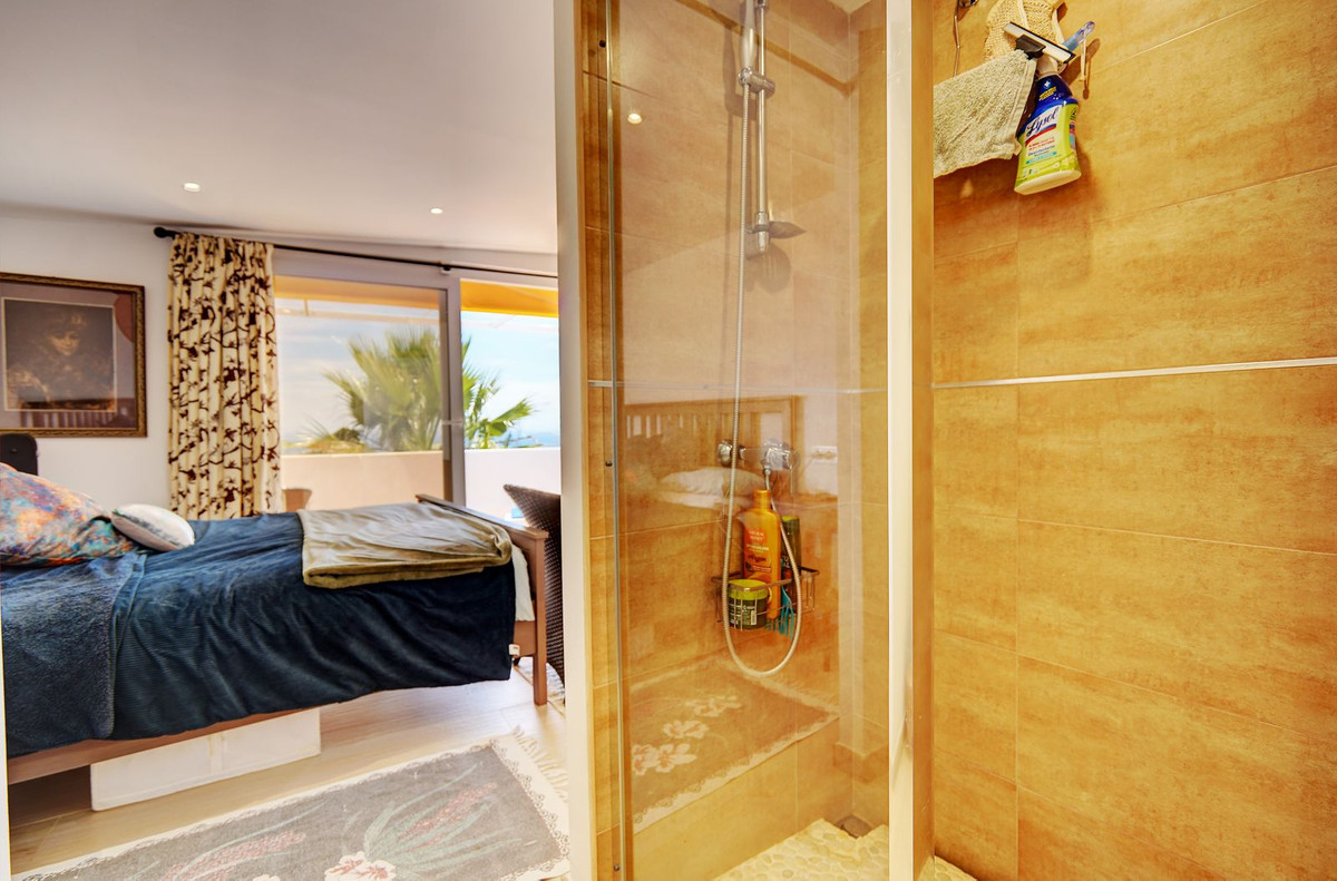The interior is laid out across two levels. On the entrance floor, you'll find a large lounge with a feature fireplace and picture window that frames the stunning views, along with direct access to a generous sea-facing terrace. The adjoining modern kitchen is fully fitted and ideal for family living and entertaining. This level also includes four double bedrooms and two bathrooms, including a master suite with ensuite bathroom, walk-in wardrobe, and terrace access.