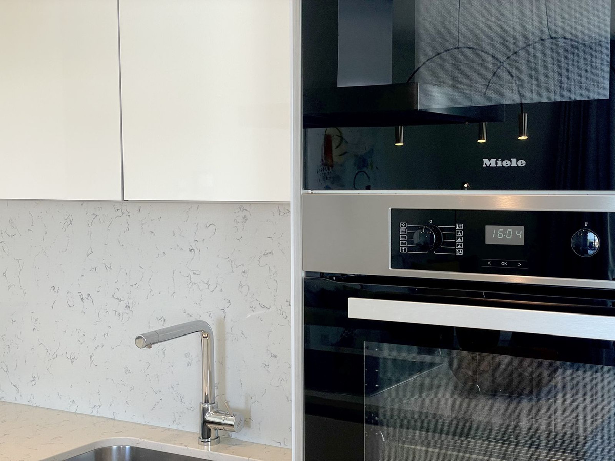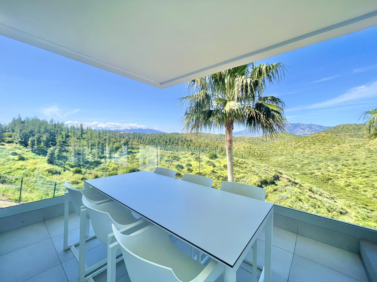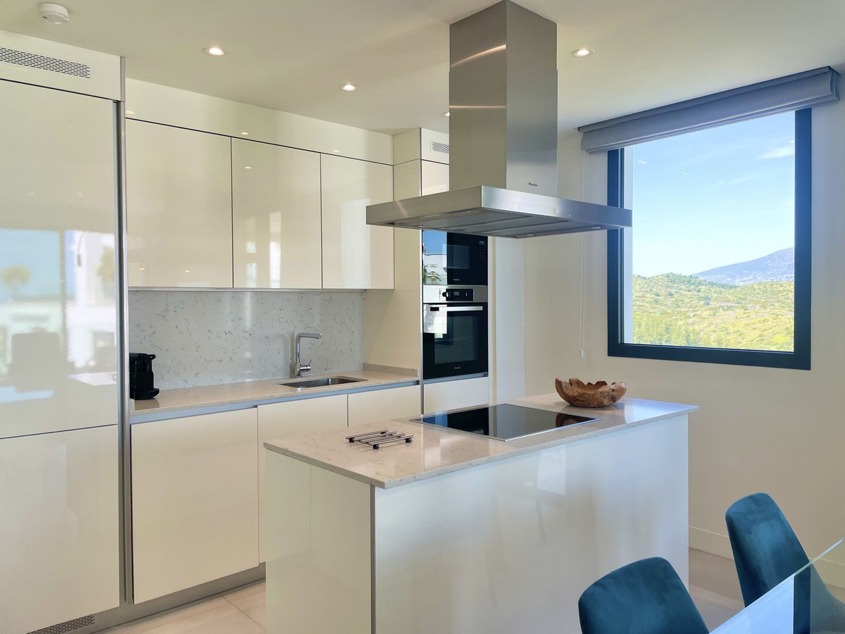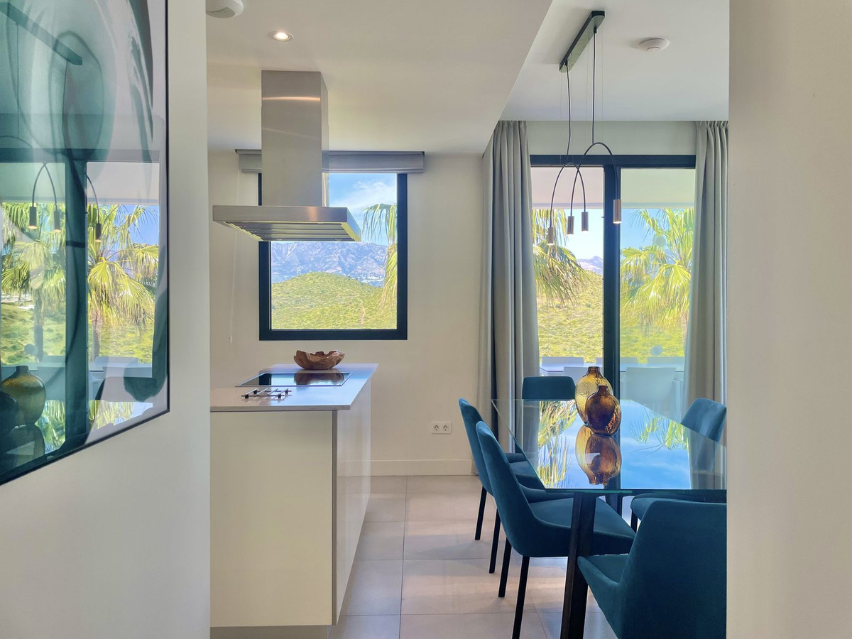 This apartment features two bedrooms and three bathrooms, with a modern, open-plan kitchen, dining, and living room. It also boasts a large private terrace with a plunge pool and sea views. The kitchen is equipped with all Miele appliances, air conditioning is integrated in all rooms, and the blinds are electric. The apartment is sold fully furnished, with underground parking and a storage room included.