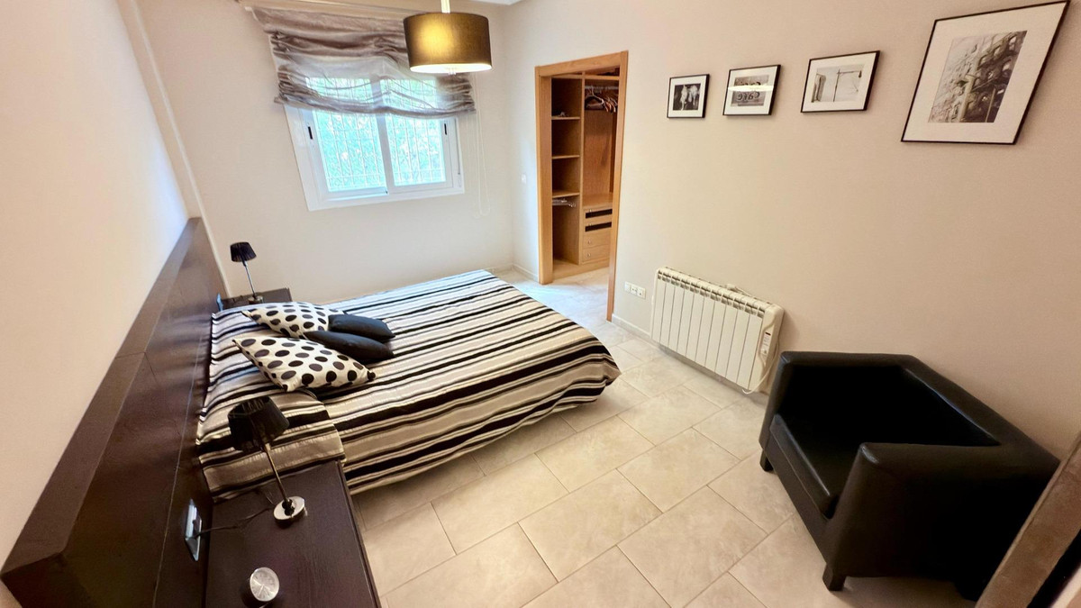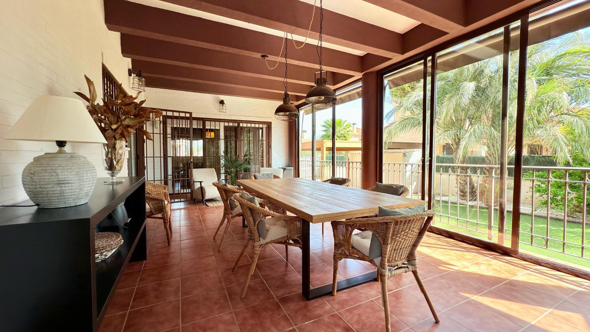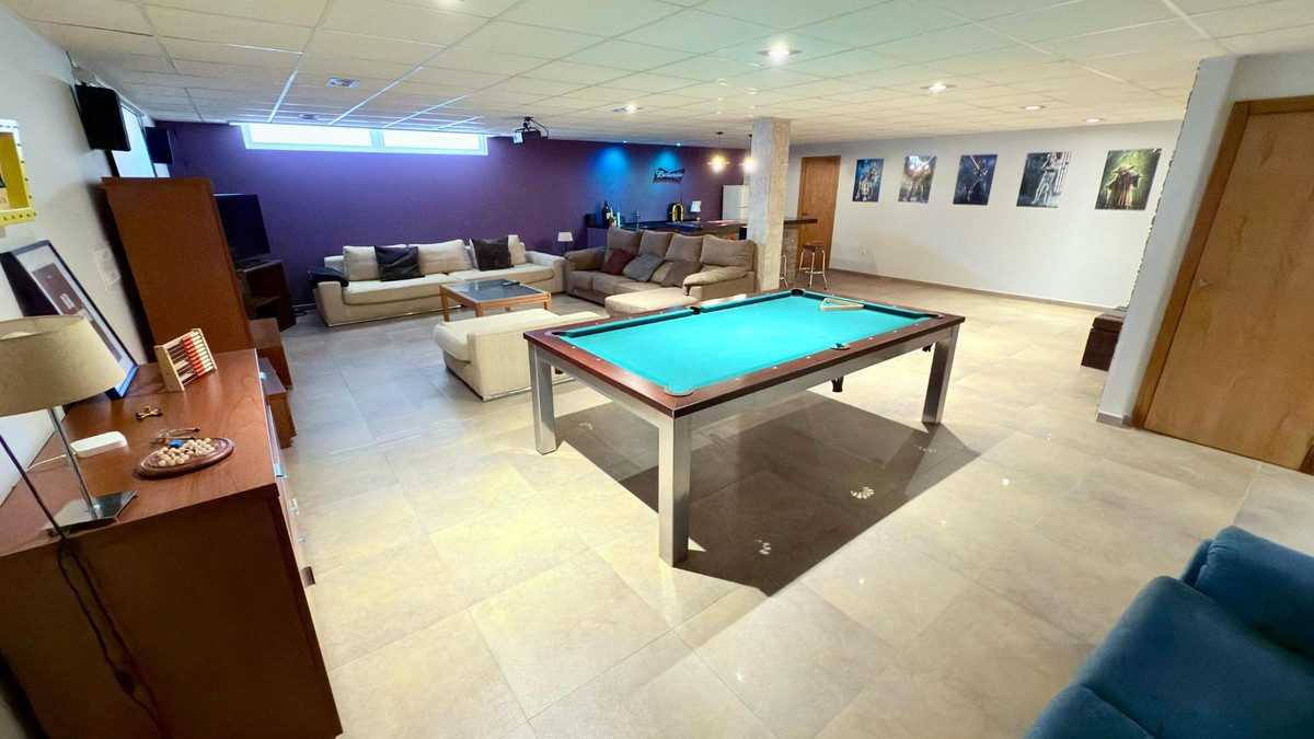 An exclusive villa is offered for sale located in Muchamiel in the Almajada area. This is a unique property, which has incredible charm and high quality materials. It consists of 2 levels: Ground floor: 4 double bedrooms, one of them en suite, a dressing room and 4 complete bathrooms. The kitchen is fully equipped with all the necessary appliances and has an exit to a glazed terrace that can be completely opened in summer, equipped with air conditioning with views to the garden. The living room of about 60 meters has a beautiful modern fireplace and an exit to the glazed terrace-porch. Semi-basement floor: Here you can find a wonderful place of leisure and relaxation, a pool table, darts, a private bar and a home cinema (home cinema). Also 2 bedrooms (1 of them is adapted as a professional music studio) a storage space and another room that can be adapted for any rental use. Plus, a huge bathroom with a jacuzzi. It's equipped with central air conditioning and electric radiators, and solar panels have been installed! The approximately 900 m2 plot offers a private pool area with garden furniture, a brick barbecue, and a well-kept garden with a border and palm trees. The area is VERY quiet for family living, with Alicante city just a 10-minute drive away, a major sports club next door, and Playa San Juan 6 kilometers away. Mercadona is a 15-minute walk away. Don't miss this opportunity to join a perfect neighborhood!