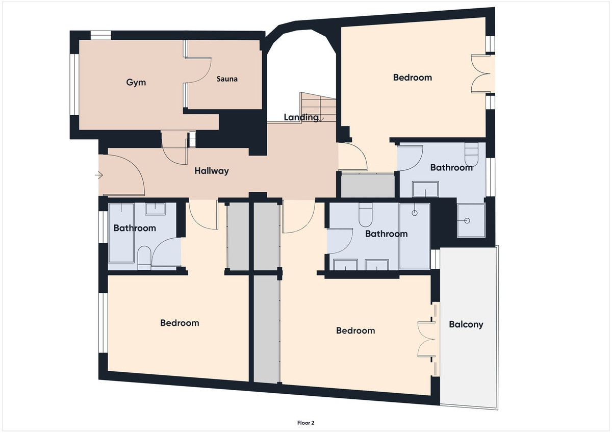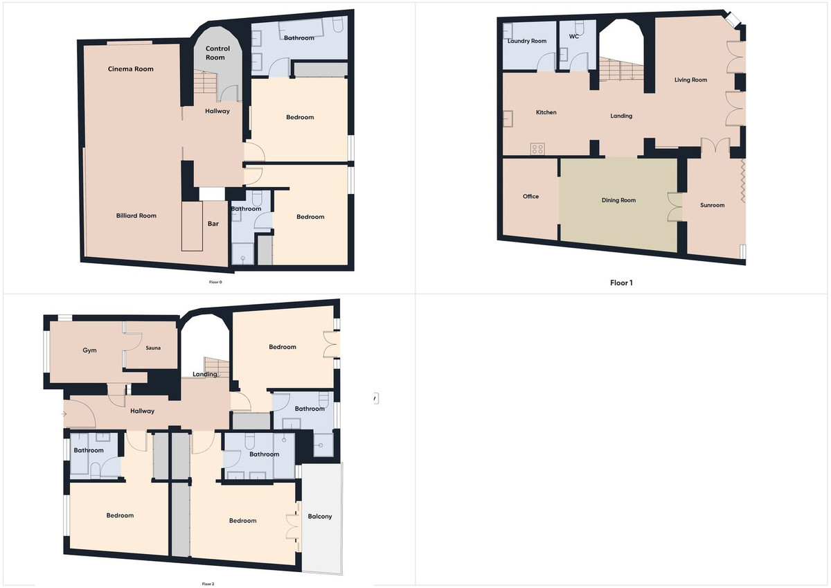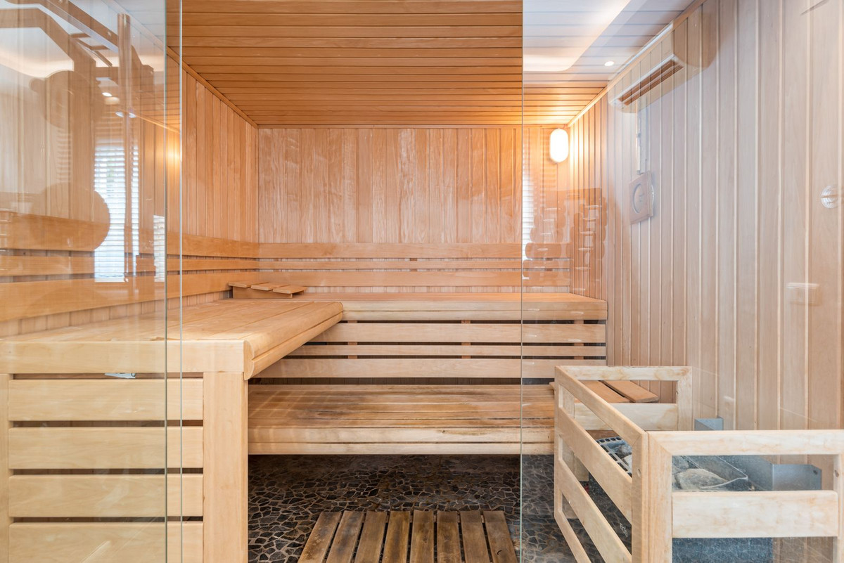 The property features underfloor heating and full air conditioning, making it suitable for both holiday living and permanent residence. Each bedroom has its own en-suite bathroom, and there is also a gym with a sauna for added comfort.
