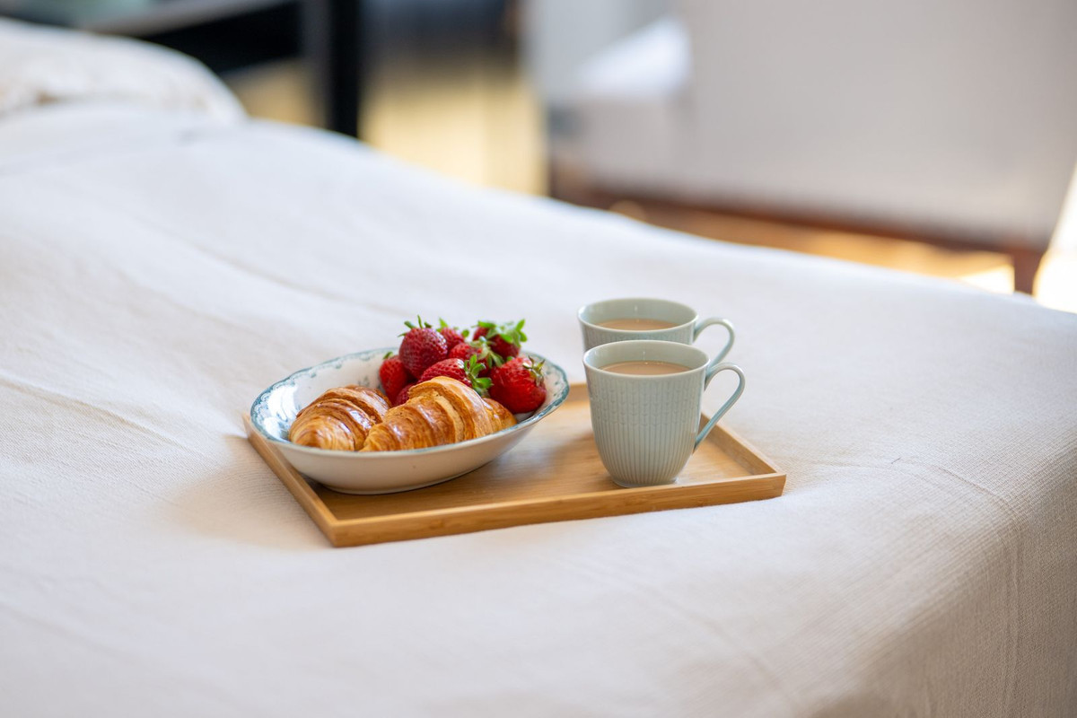 På övervåningen finns ett ljust sovrum med privat terrass och panoramautsikt över havet samt ett eget komplett badrum.