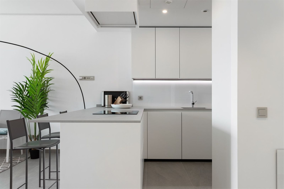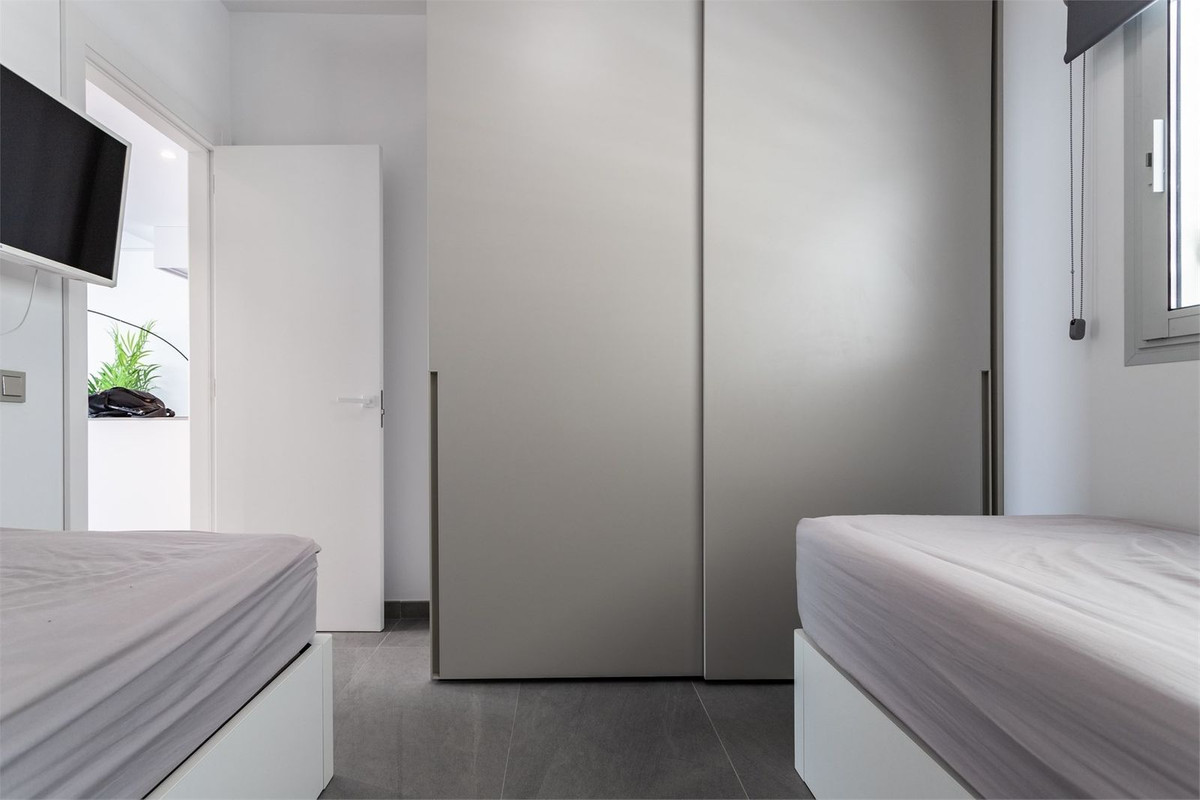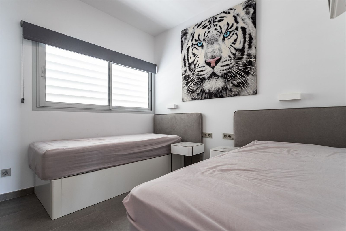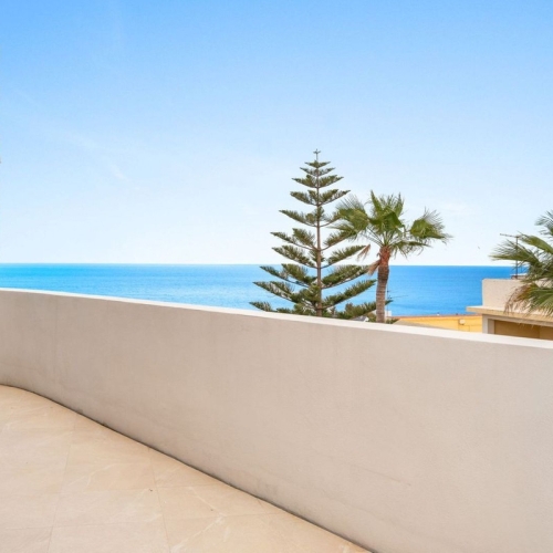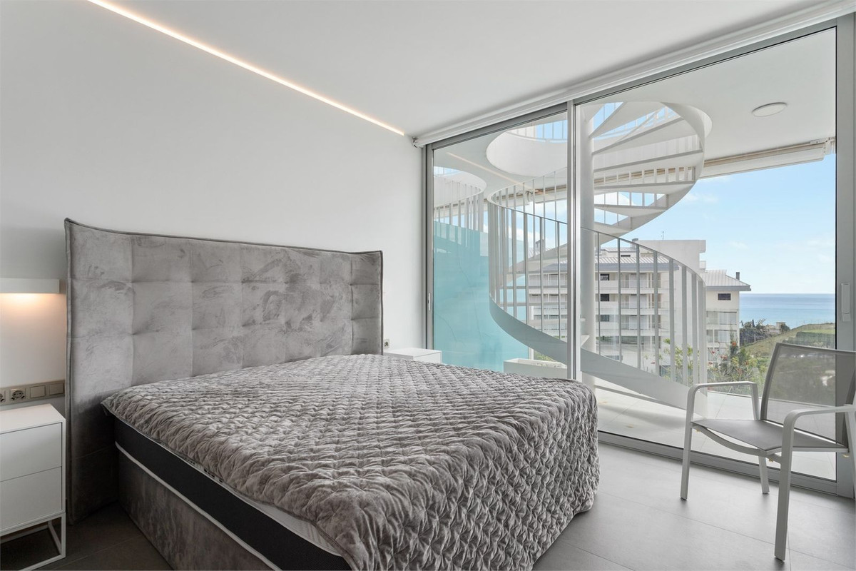 Bostaden har en modern stil och erbjuder två sovrum samt två badrum, varav ett en-suite. Det öppna köket och vardagsrummet skapar en luftig och inbjudande atmosfär. Genom skjutpartiet når vi en sydvästvänd terrass på hela 22 kvm med en imponerande utsikt över Medelhavet. Utöver detta finns även en takterrass på 107 kvm med jacuzzi installerad, perfekt för avkoppling.