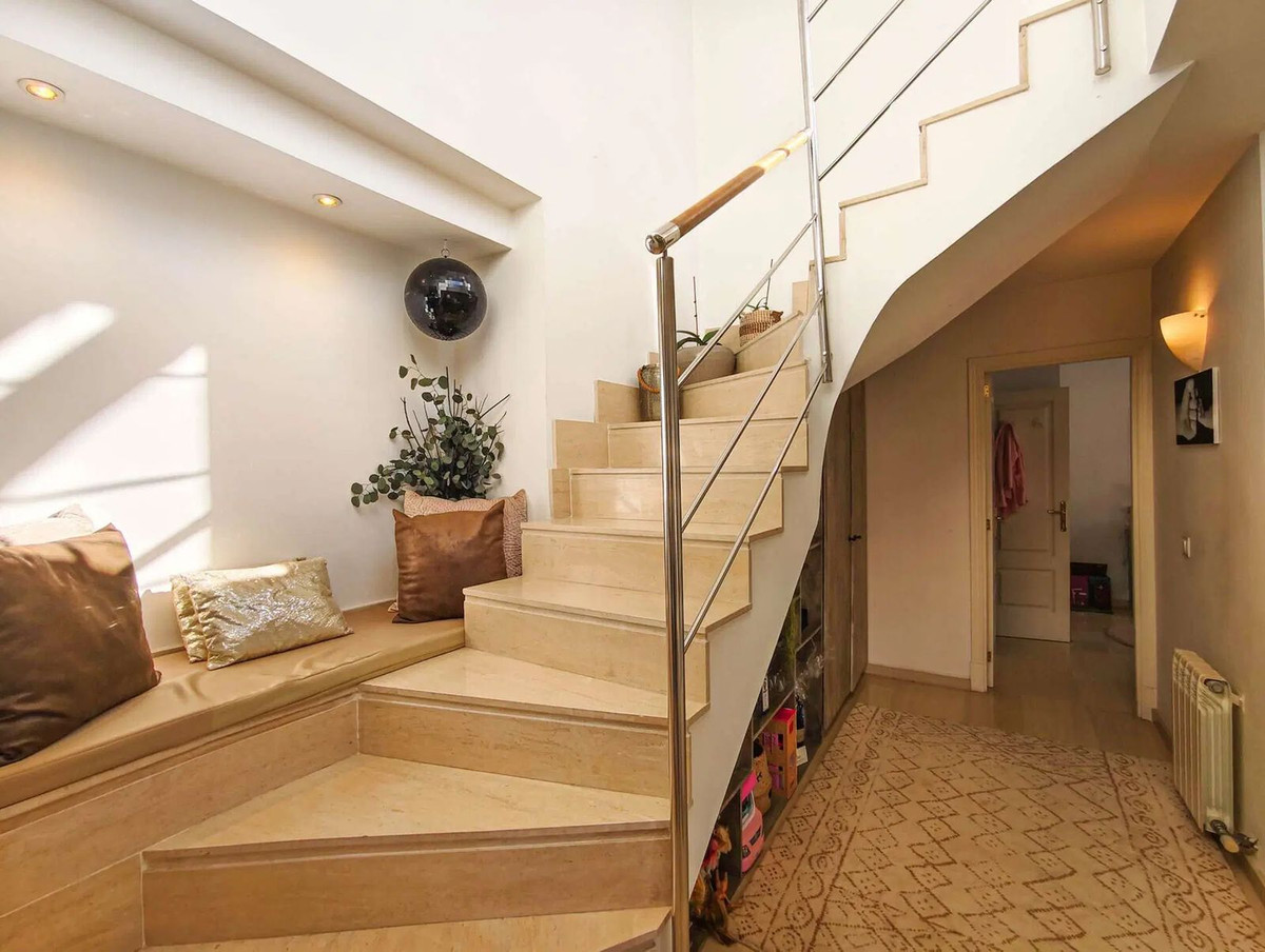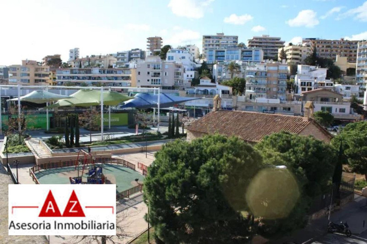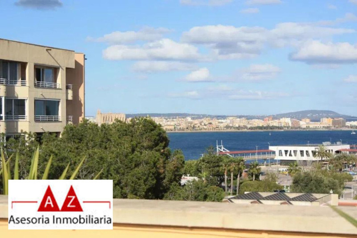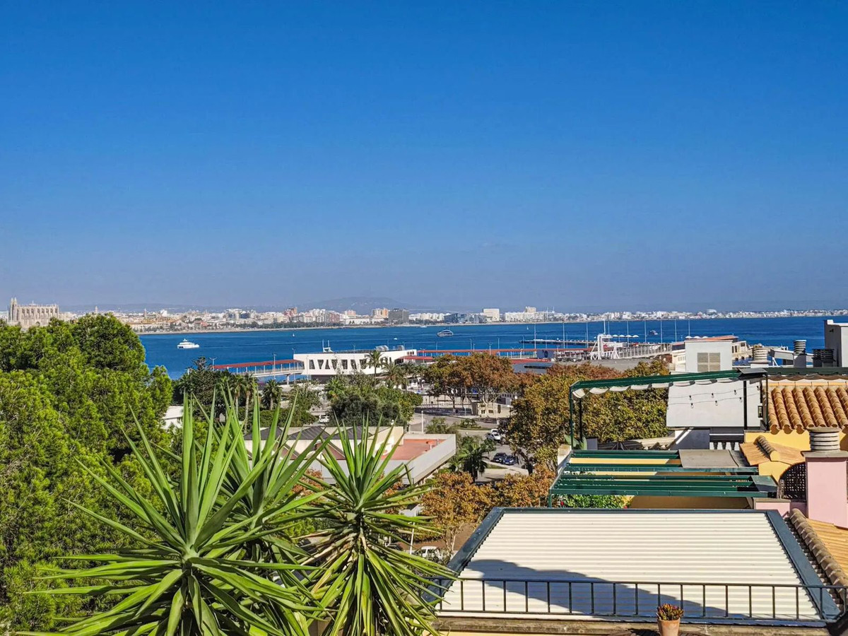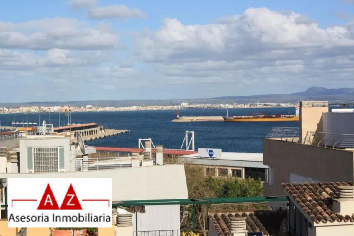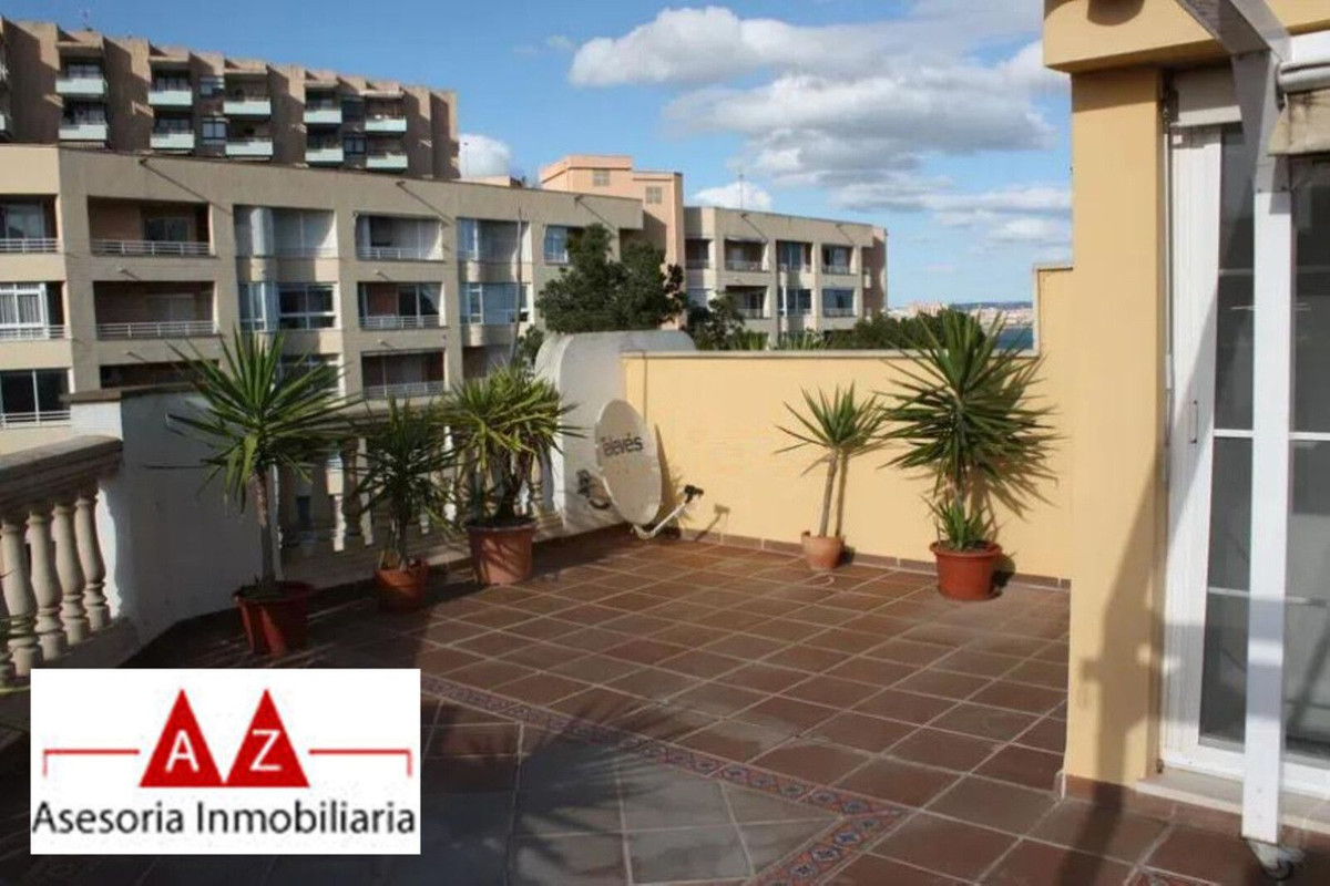 Duplex penthouse in the Porto Pi area, with a 175m2 solarium terrace, less than 2 minutes from the seafront promenade, bus stops, a 24-hour pharmacy, and the Porto Pi shopping center with all its amenities. On the ground floor, there is a small entrance hall, a toilet with shower, a large built-in wardrobe, and a triple bedroom with a dressing room and en-suite exterior bathroom. Up a small flight of stairs is the living-dining room, a fully equipped modern kitchen, another exterior-facing double bedroom with a built-in wardrobe and en-suite bathroom, and a short, beautiful hallway that coincides with the space under the stairs leading to the terrace. The solarium features a 55m2 terrace with views of the sea, the cathedral, and the Porto Pi maritime area with San Carlos Castle and the sea in the background. The entire house is very bright. All rooms are exterior except for the toilet and the upper bathroom. Air conditioning with heat/cold pump is available in the living room and all bedrooms. Gas heating is available in all rooms and in the bathrooms via towel racks. PVC exterior carpentry with double glazing. The price includes a 4.5 m² storage room and a 12 m² parking space. Another 12 m² space is possible. The building was built in 2002 in a traditional Mallorcan style. The building is very quiet with only four neighbors, two per floor. The property is very well maintained. Community fees are approximately €70 per month. There is no elevator and the apartment is located on the first floor and a half from street level and a second floor and a half from the garage.