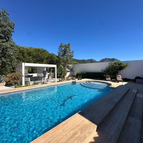 Located in the serene enclave of Torremuelle, this detached villa offers an unmatched blend of luxury and tranquility. Nestled along the Costa del Sol, this villa boasts breathtaking panoramic views of the Mediterranean Sea, complemented by lush greenery and picturesque surroundings. The villa's modern design is seamlessly integrated into the natural landscape, featuring expansive glass walls, spacious terraces, and open-plan living areas that bathe the interior with natural light.