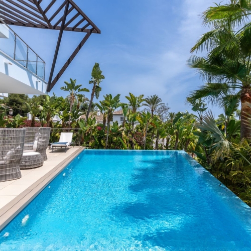 Located in a secure and exclusive neighbourhood beneath the Sierra Blanca mountains, Casa Serenity combines privacy with timeless Andalusian style. Residents enjoy landscaped grounds and an architect-designed pool in an area known for its peaceful charm and proximity to Marbella's best amenities.