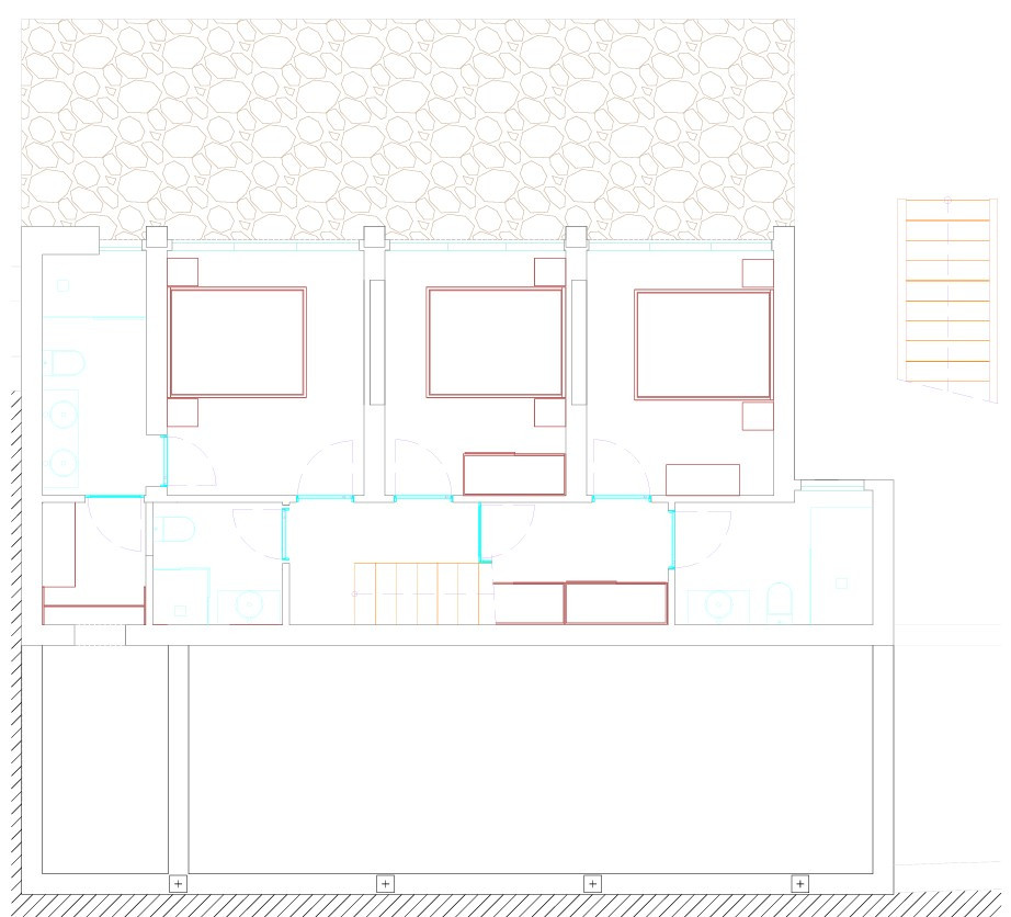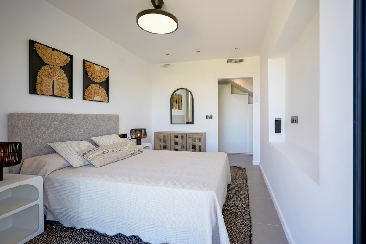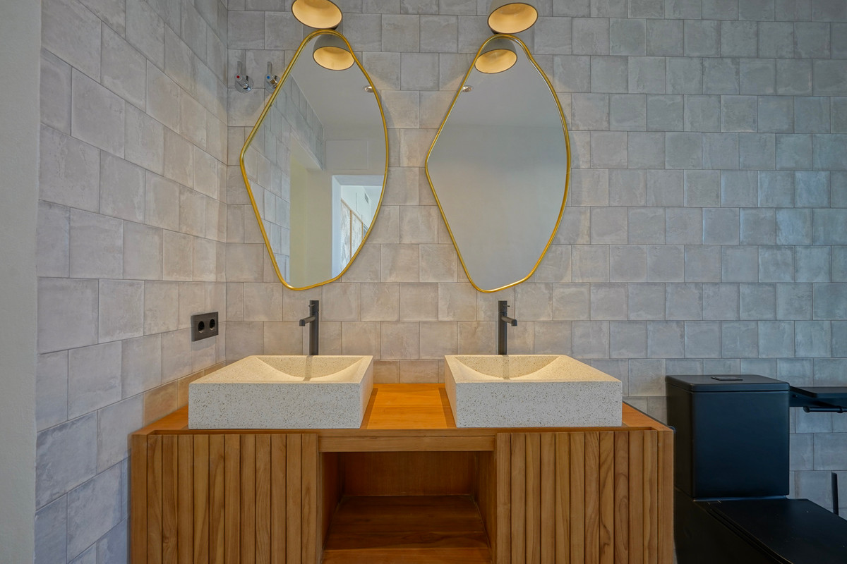 On the ground floor are three elegant bedrooms, each with its own luxurious bathroom. All bedrooms have direct access to the terrace and swimming pool. The villa is equipped with modern amenities such as electric underfloor heating and air conditioning, ensuring optimal comfort all year round. Natural materials such as natural stone and wood have been combined in the construction of this villa for a stylish and timeless result.