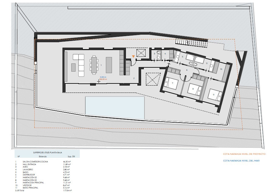 Modern villa på en tomt på 800 m² i Monte Solana med 200 m² boyta, en privat pool på 32 m² och en öppen terrass på 40 m². Inkluderar kanalbaserad luftkonditionering (värme och kyla) för komfort året runt. En perfekt kombination av stil och utomhusliv.