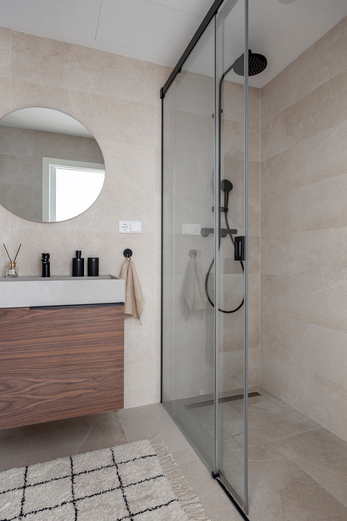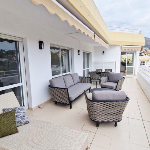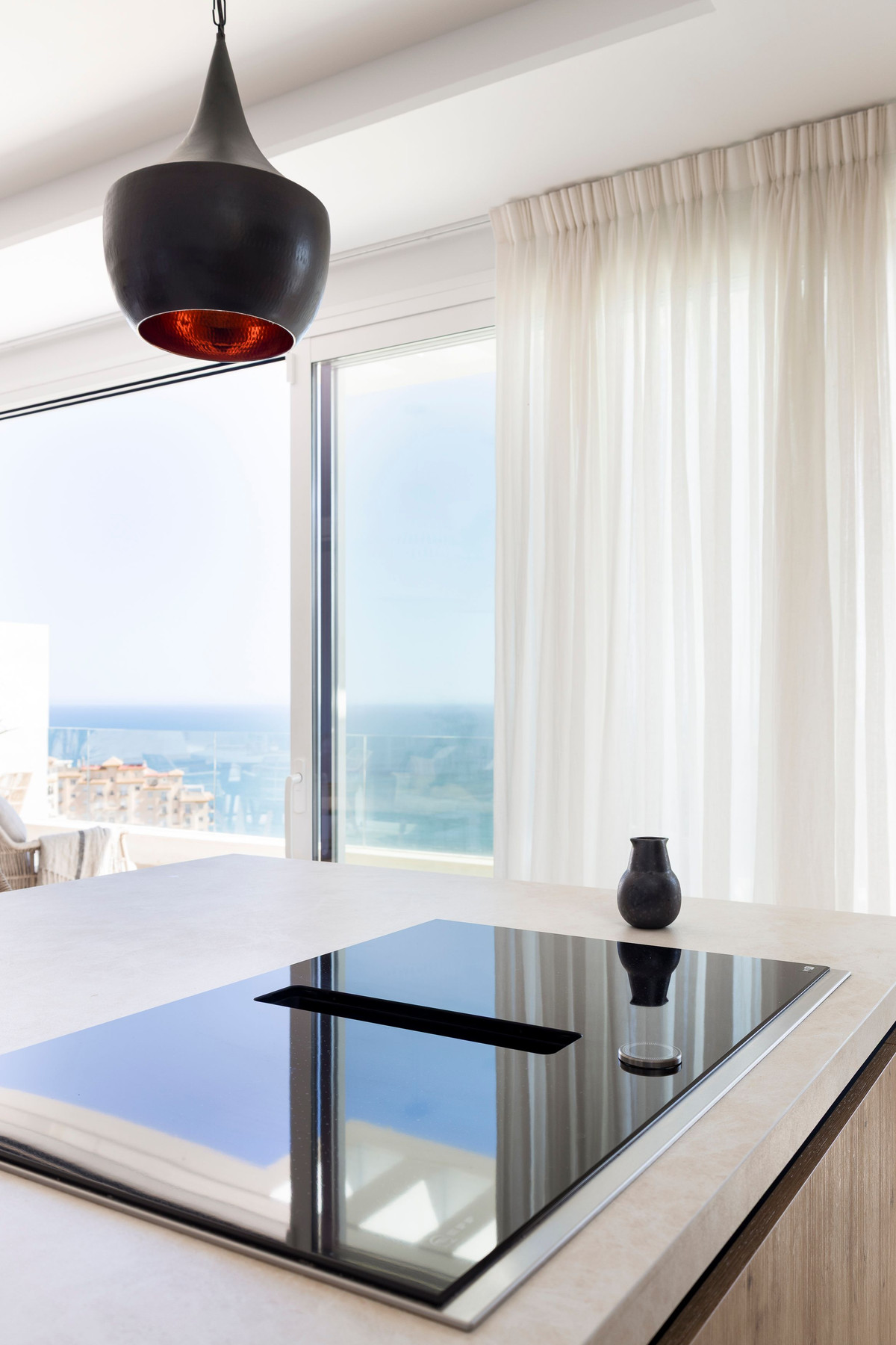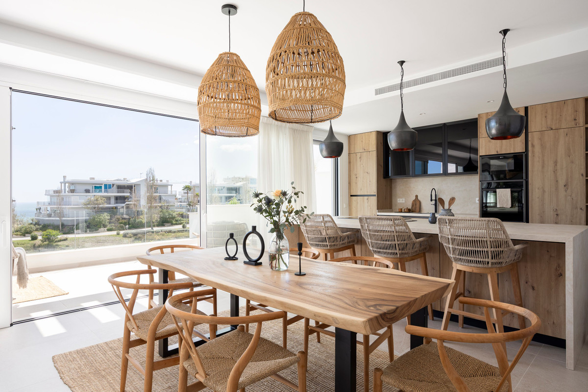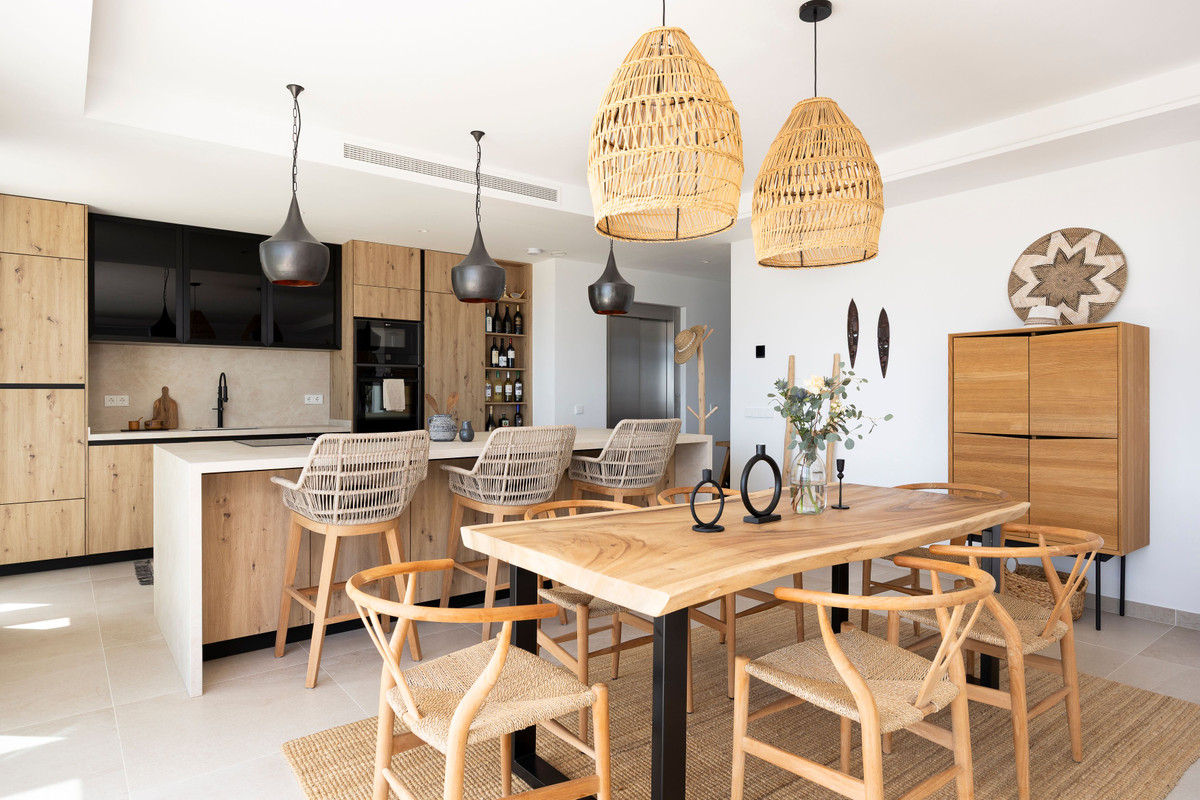 När du kliver in möts du av ett öppet utrymme som sömlöst förbinder kök, matplats och vardagsrum – med direkt tillgång till en stor terrass, utrustad med 9 meter långa elektriska markiser med vindkänslighet.