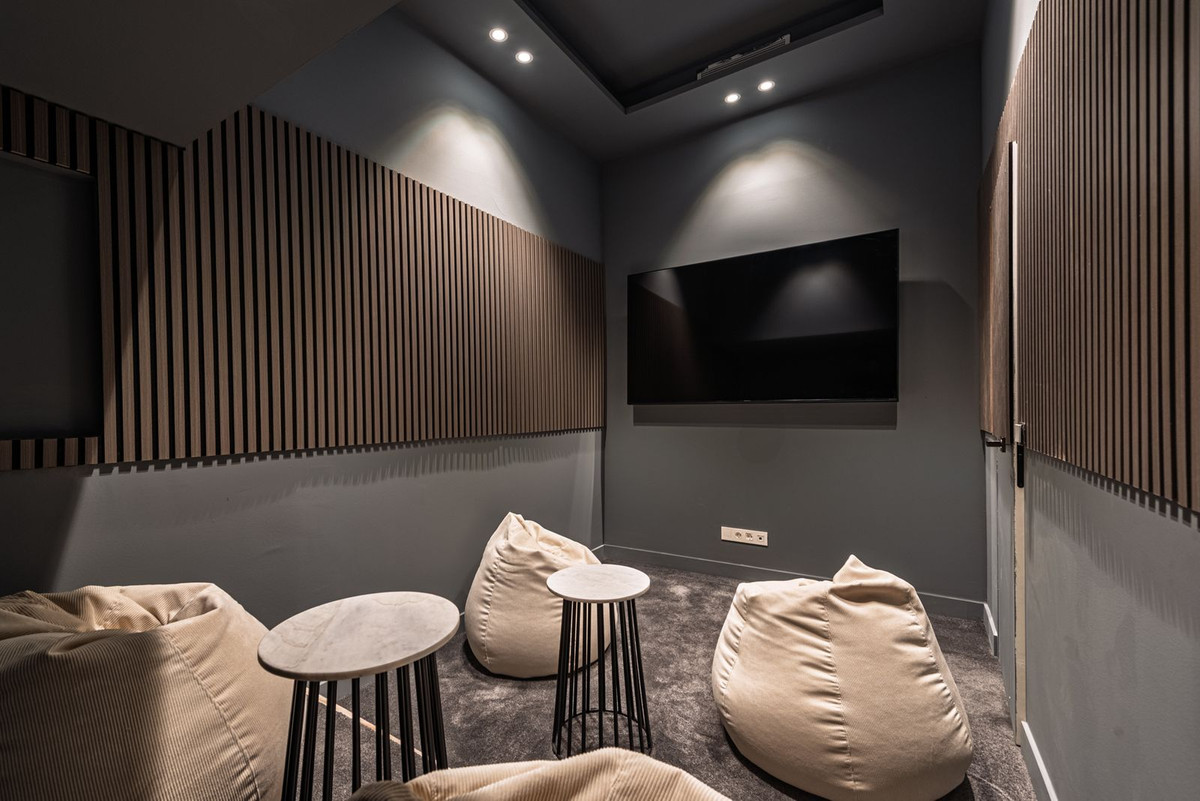 The basement is designed for leisure and fitness, featuring a fully equipped gym and a home cinema. An additional bedroom ensures privacy and comfort for guests or family members.