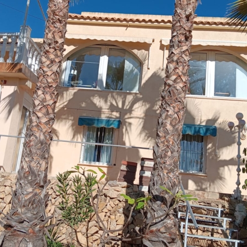 On the lower level, a self-contained guest apartment with its own entrance provides a comfortable living/dining area, a semi-open kitchen, a bathroom, and a spacious bedroom. The property boasts a beautifully maintained private garden, a private  pool, ample parking, and a rooftop terrace with stunning views of the nearby mountains and coastline. With potential for expansion and a holiday rental license, this villa is a versatile gem, effectively functioning as two distinct homes.