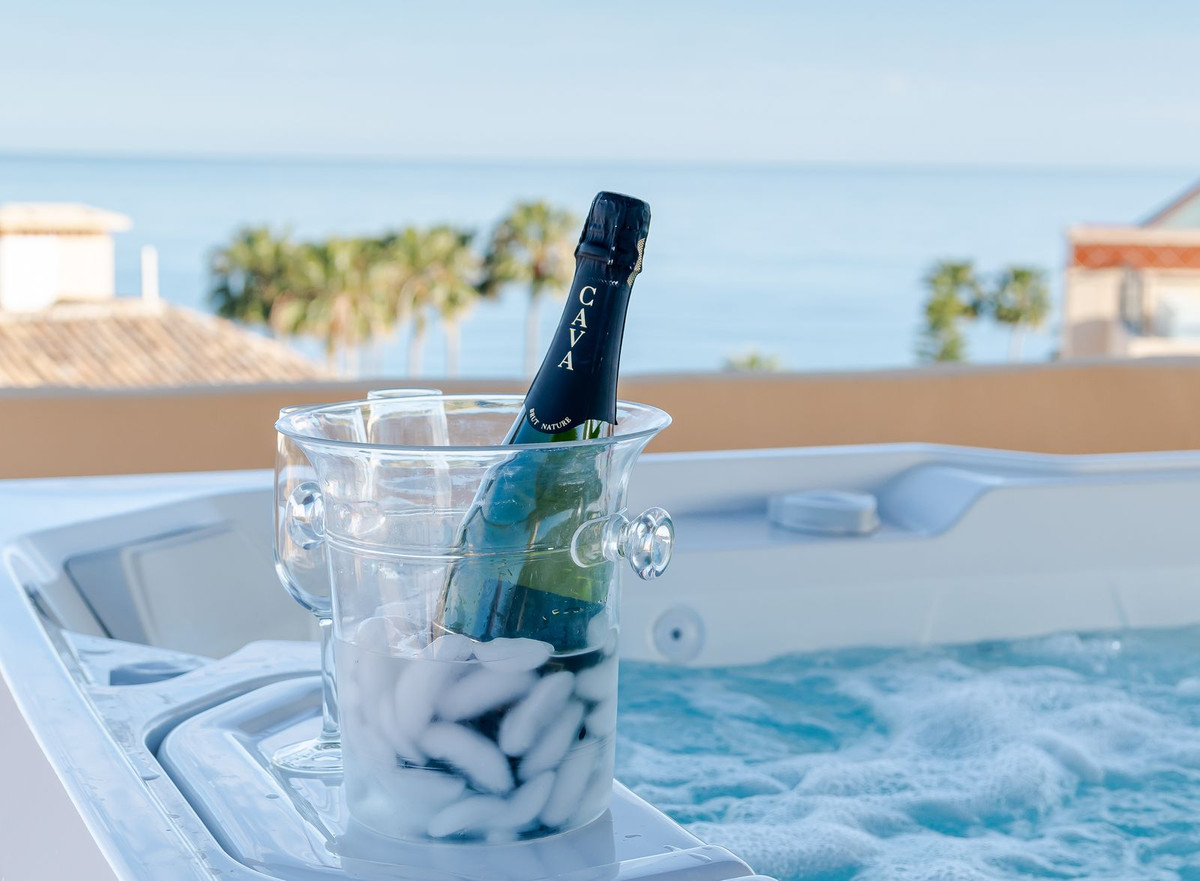 Intill vardagsrummet finns en stor, delvis täckt terrass med inbyggd grill som bjuder in till utomhusmåltider med spektakulär utsikt över kusten. En spiraltrappa leder upp till det expansiva taksolariumet, som erbjuder 360-graders vyer från Marbellas och Esteponas berg till Gibraltar och Nordafrikas kust. Den övre terrassen har ett generöst jacuzzi, skuggad loungehörna och plats för solbad – den ultimata platsen för avkoppling eller sociala tillställningar.