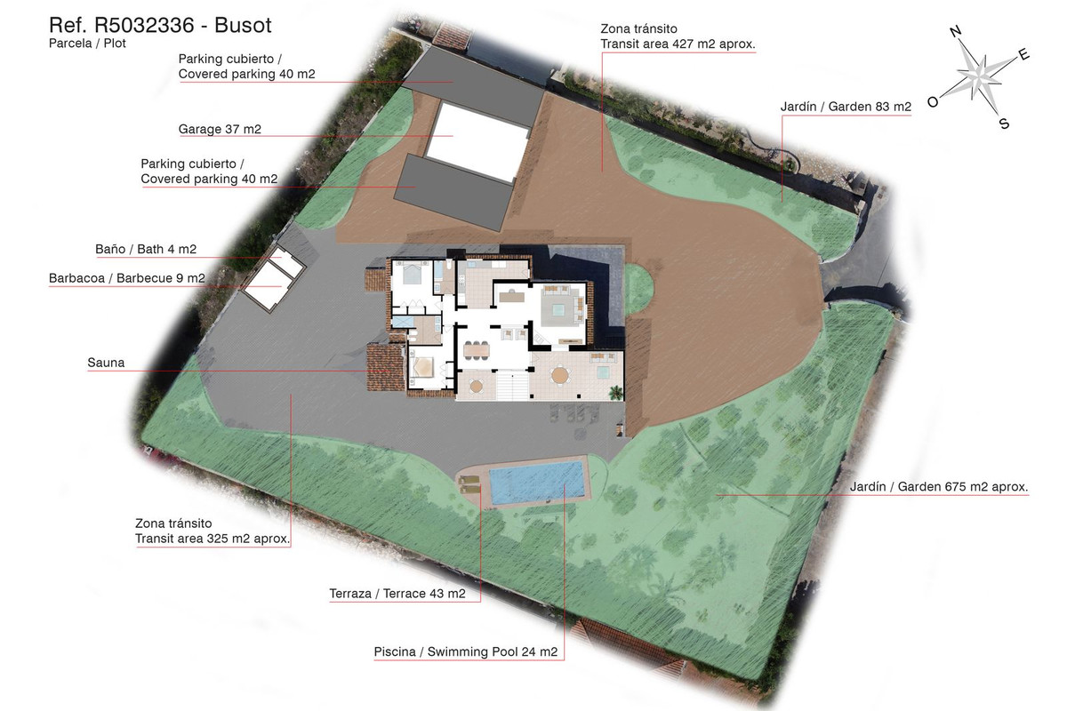 • Beautifully landscaped plot with graveled areas, mature Mediterranean trees, shrubs, and hedges.