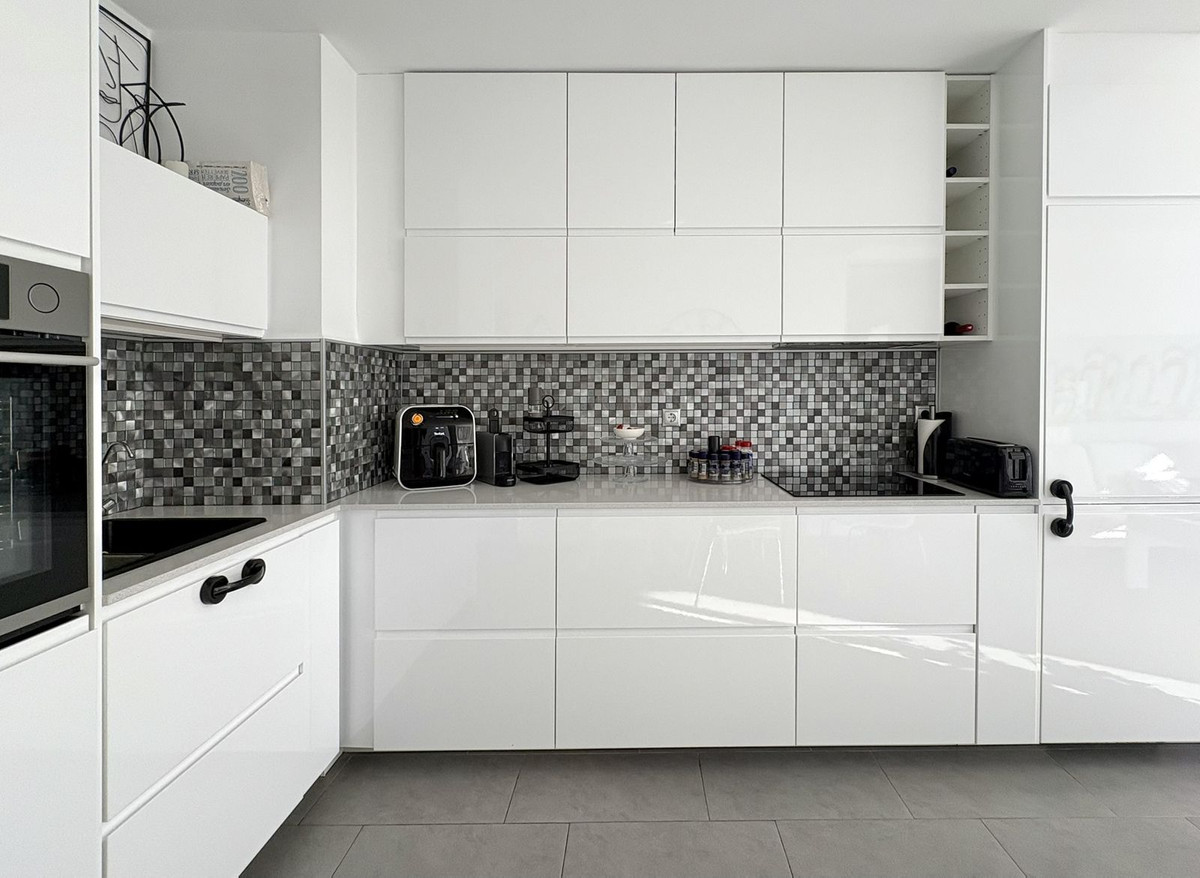Invändigt möts du av ett helt nytt IKEA-kök med blanka vita luckor och gott om förvaringsutrymme – både snyggt och praktiskt.