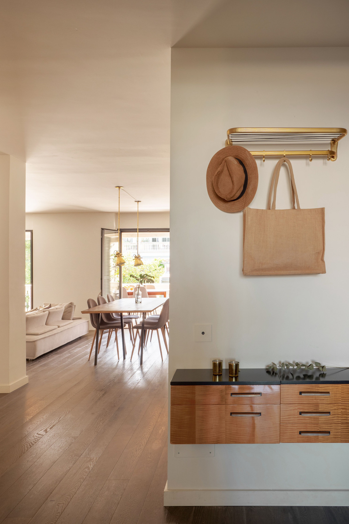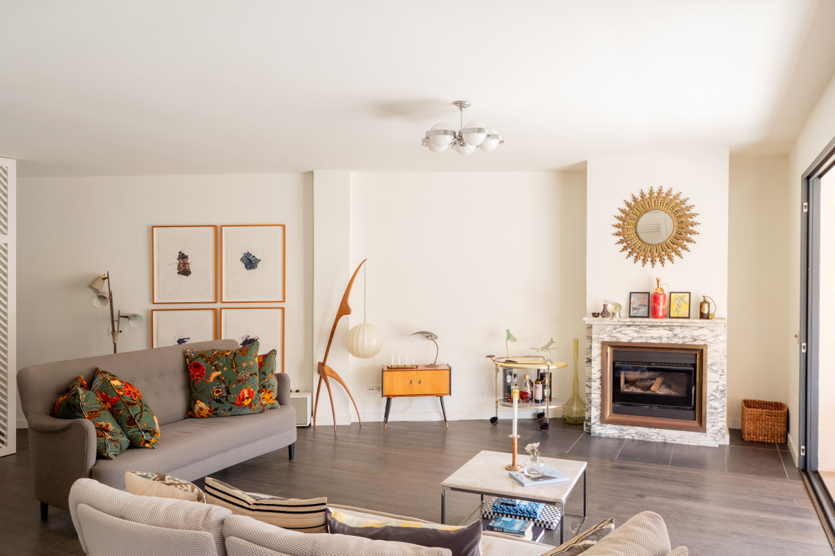 Vardagsrummet är stort och inbjudande med öppen spis, matplats och stora skjutdörrar i glas som leder ut till en härlig terrass på 36 m². En idealisk plats för att läsa en bok i lugn och ro eller njuta av middagar i kvällssolen.