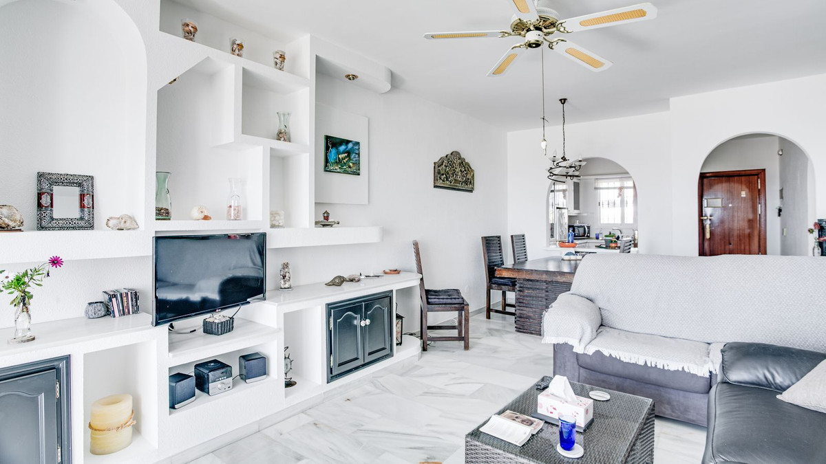 This apartment is located on the first floor of a small residential complex directly on the golf course of El Chaparral. The location is one of the most sought-after residential areas in the region. Within a few minutes, you can reach the popular coastal town of La Cala de Mijas, with restaurants, shopping options, and a well-maintained beach. The living room is bright and offers access to the terrace with sea views. A pass-through connects the living area with the adjacent kitchen. The master bedroom also offers sea views and an en-suite bathroom with a bathtub and shower. The second bathroom has a shower and a laundry area with a washing machine and dryer – both bathrooms have windows. The complex consists of four buildings, each with four apartments, and a communal pool. A closed garage space is included in the price. The connections to Málaga and Marbella are excellent.