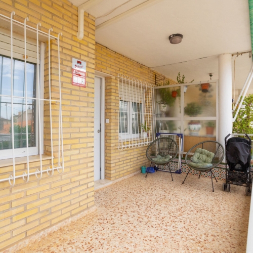 Torre de la Horadada – Residencial Cañada Real . We present this charming duplex townhouse located directly in front of the communal pool, in one of the most pleasant residential complexes in the area.. . The property offers a built area of 70 m2, distributed over two bedrooms, two bathrooms, a bright living-dining room, a fully equipped open-plan kitchen, and a spacious rear patio—ideal for laundry or storage.. . At the front, there is a large tiled terrace of approximately 20 m2 with direct access to the pool, perfect for enjoying the sun and landscaped surroundings. . The home is sold fully furnished and equipped, including air conditioning.. . The residential complex features extensive green areas and two communal pools, offering a quiet, well-maintained, and family-friendly environment just minutes from the beach and all essential services.