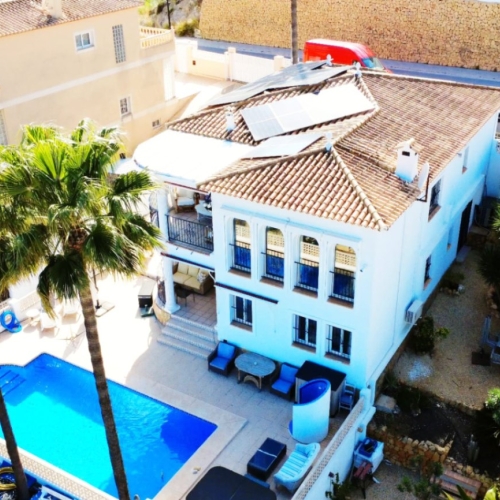 Om du letar efter ett rymligt och bekvämt hus i ett lugnt område med havsutsikt, presenterar vi dig detta stora chalet i La Nucia. Det är en fastighet med en tomt på 2000 m2, där du kan njuta av en privat pool och ett grillområde. Huset har 8 sovrum och 10 badrum, alla sovrum har eget badrum, och huset har två våningar. På bottenvåningen hittar du ett stort och ljust vardagsrum med stora fönster som ger dig en spektakulär utsikt över Medelhavet. Det finns också en stor terrass som är halvt täckt där du kan koppla av eller äta utomhus. Köket är stort och modernt, med ett skafferi intill. På nedre våningen finns det 5 sovrum till, också med eget badrum. Huset har luftkonditionering kall/varm och är anpassat för personer med nedsatt rörlighet. Det är ett perfekt hem för en stor familj. Från huset är har du al service inom 5 minuters bilfärd, strand 10 minuter med bil etc.