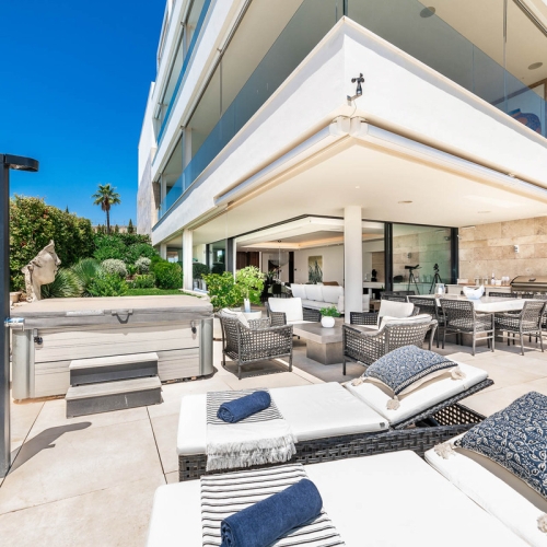 Luxury and spacious 3 bedrooms, 3 bathrooms apartment with nice sea views, situated in a private gated urbanization: Buenavista de La Quinta. This apartment is located in a small complex of 6 apartments in a rather unique and distinctive architectural style that you don't often encounter in the region and that contrasts with all the white apartments that are often being built. Offering lush gardens and a communal swimming pool. Buenavista is well known for its exclusivity, privileged situation and luxuries quality's. Featuring intelligent home system, electric shutters, under floor heating in bathrooms, air conditioning hot/cold with individual control, fireplace, fully equipped kitchen, Siemens appliances, safe, first quality marble flooring and many other extras. This elevated ground floor South orientated property has 161 m2 built, plus a spacious covered and uncovered terrace of 67 m2 from which you will have the best views over the sea. The terrace has access from the lounge, the master bedroom and 1 guest bedroom. The bright kitchen has a useful adjacent laundry area and a nice French balcony with great views. The property comes with un underground parking space and a storage room.