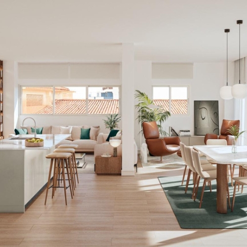 Spacious living room, open-plan kitchen and dining area, laundry room