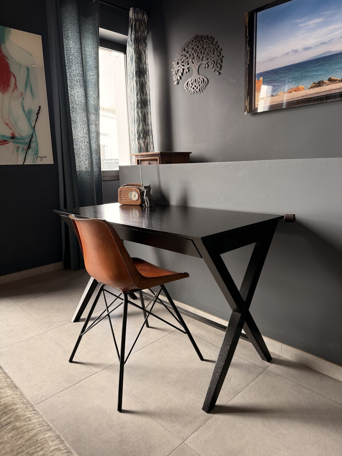 The apartment features an open living concept with dramatic double-height ceilings, original wood beams, and a cozy wood-burning stove. Every detail has been carefully considered in the stunning furnishings and decoration.