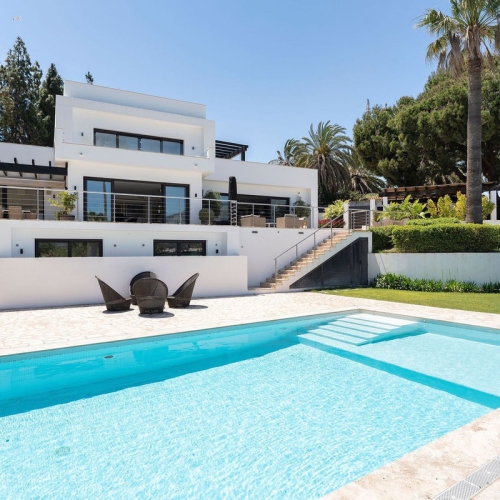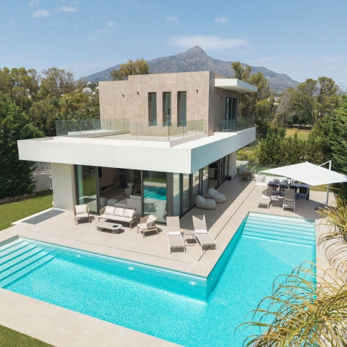 This impressive luxury villa, exclusively available through our sole agency, is situated in the desirable neighbourhood of Nueva Andalucia. Boasting a substantial built area of 510m² on the best Plot with a generous 1,200m² very high privacy factor , the property offers six spacious bedrooms, five bathrooms (four en-suite), and an additional guest toilet, designed to accommodate the highest standards of modern HIGH Quality family living.
