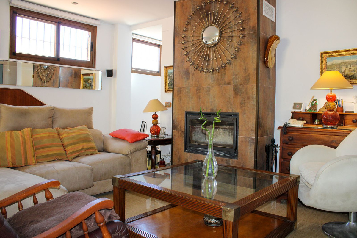En rymlig hall hälsar oss varmt välkomna in i huset på entréplan, här har ni till vänster ett stort vardagsrum med stora fönster för mycket ljus och underbar utsikt över bergen. En braskamin finns i mitten av rummet, för att ge en behaglig inomhustemperatur under de kyligare vintermånaderna. Här har vi även en utgång till en av de många terrasser som huset har.