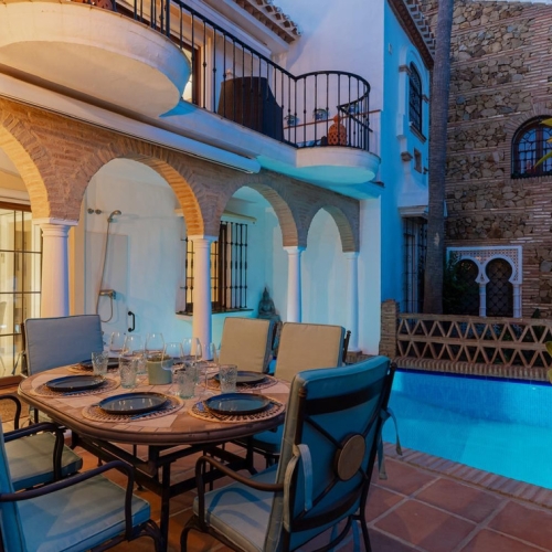 Located in a peaceful and exclusive setting, it combines Andalusian style charm with modern comfort. Situated in a well-kept urbanization in Mijas Golf, the house stands out for its traditional architecture with contemporary touches, high ceilings and large windows that flood the spaces with natural light.