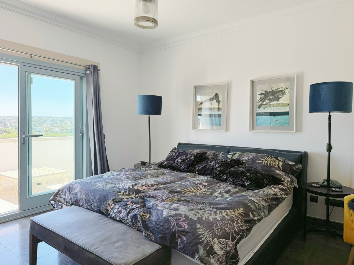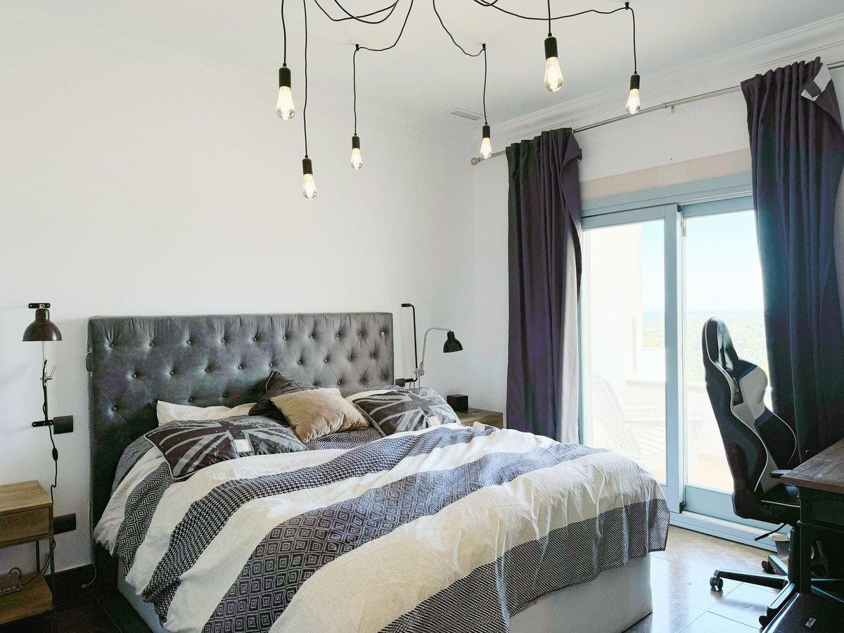 The master suite occupies the upper floor and includes two private terraces, a cozy lounge with fireplace, a dressing room, and a luxurious bathroom with jacuzzi—offering serene views of the sea.