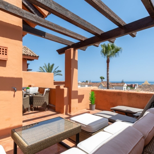 Upptäck kustens sofistikering i denna vackert omdesignade penthouse med 2 sovrum och 2 badrum på New Golden Mile. Beläget i ett lugnt, gated, charmigt pueblo-stil samhälle i Benamara, erbjuder detta toppvåningsobjekt en sällsynt kombination av konstnärlig design, modern komfort och enkelt strandliv. Denna penthouse ligger bara några minuters promenad från Salduna Beach och endast 10 minuter med bil från Puerto Banús glittrande glamour.