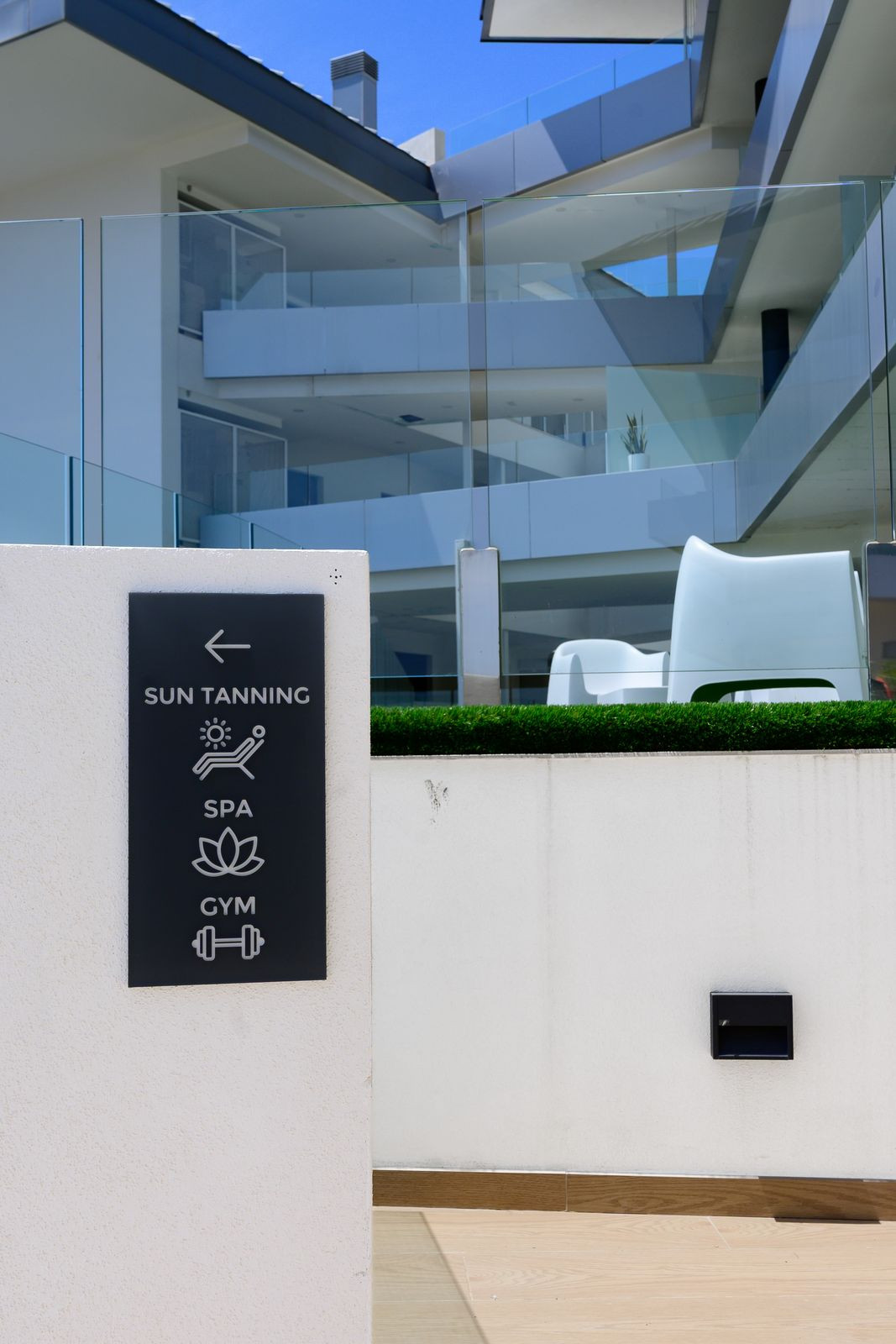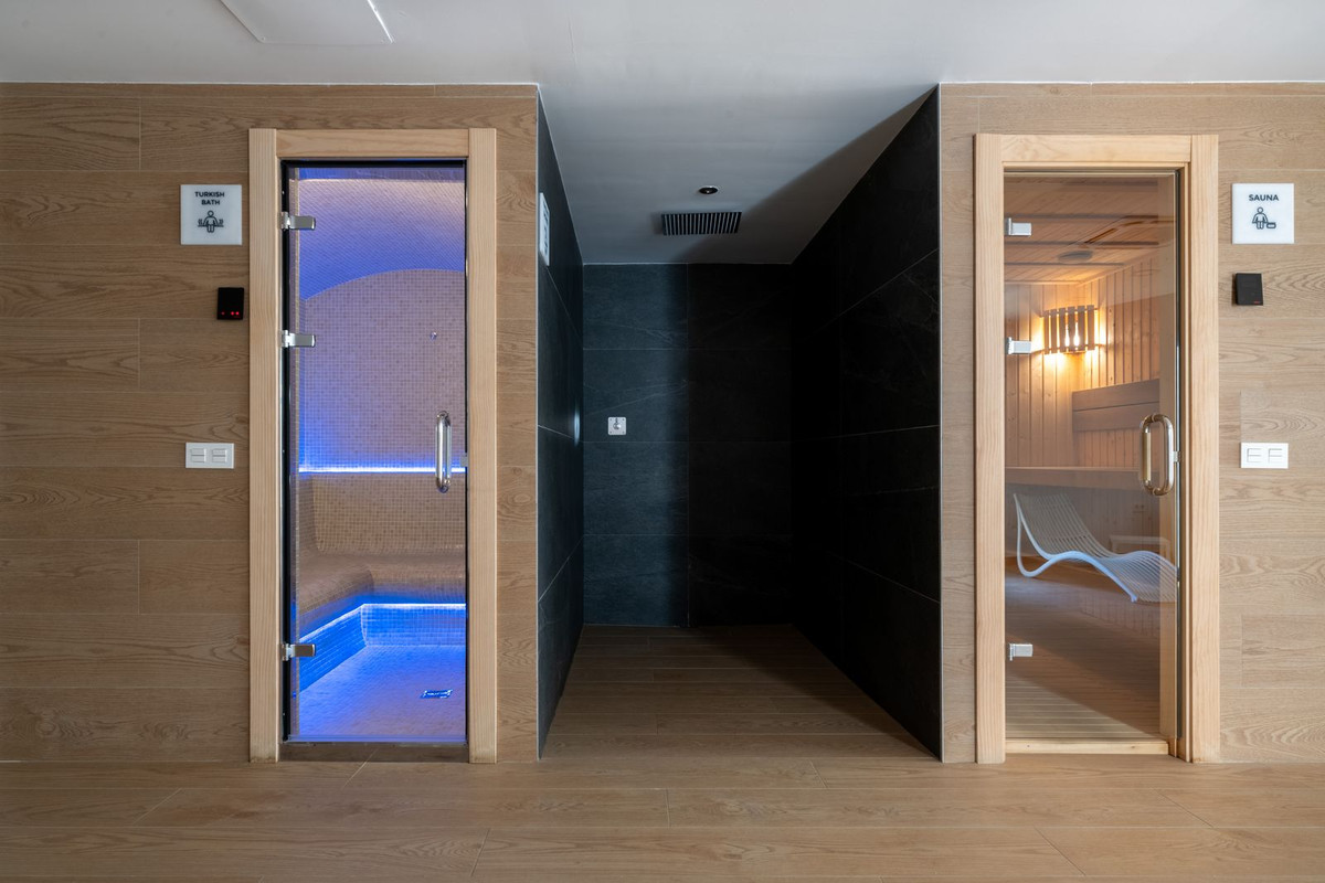 The complex offers exclusive communal facilities including an infinity pool, fully equipped gym, sauna, Turkish bath, landscaped gardens, chill-out area, and solarium — all with brand-new furniture and modern installations delivered in February 2024.