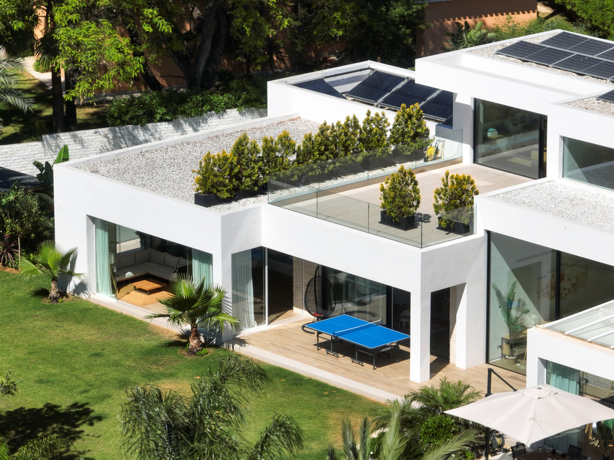 Fastigheten är placerad på en rymlig tomt om 3 397 m² och är ett mästerverk inom modern arkitektur, omgiven av en professionellt anlagd trädgård som utstrålar fridfullhet. Gröna gräsmattor sträcker sig längs med en privat tennis/padel-bana och en imponerande 25 meter lång pool med funktioner som infinity-kant, jacuzzi och ett motströmsystem, vilket ger gott om utrymme för både rekreation och avkoppling. Själva villan sträcker sig över imponerande 1 497m² och uppvisar en förfinad modern estetik som förenar rena linjer med eleganta ytor. Interiören är noggrant designad för att maximera komfort, med rymliga, öppna vardags- och matsalsytor som smälter samman med de stora terrasserna, där du kan njuta av panoramautsikt över trädgårdarna och de avlägsna bergen.