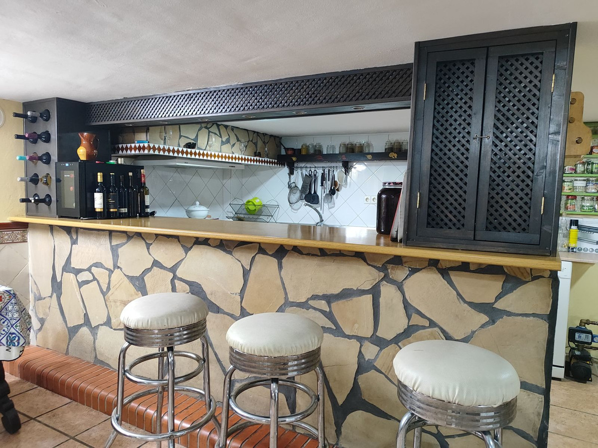 Garage for car and motorbike, bathroom, office, and lounge with fitted kitchen, bar, and stools.