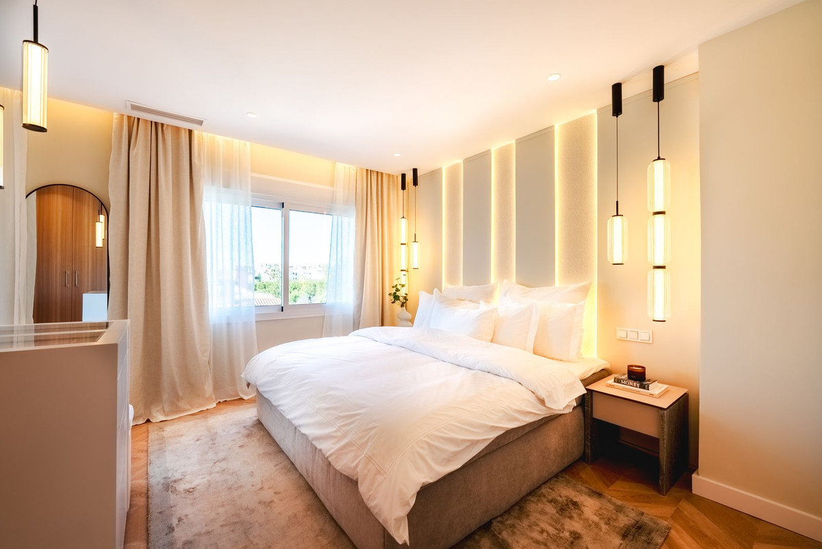 This brand new renovation project is a beautifully crafted 5-bedroom, 5-bathroom Town Villa located on Marbella's prestigious Golden Mile. Blending contemporary Scandinavian elegance with Mediterranean charm, the home offers four levels of luxurious living with expansive south-facing terraces and sweeping sea views.