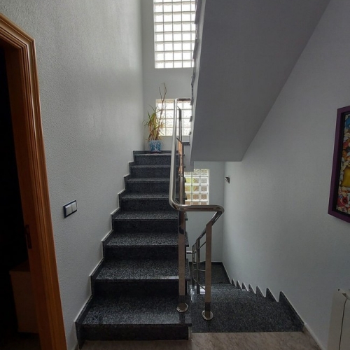 This spacious property features 5 bedrooms, 3 bathrooms, and includes a living/dining area along with a fully equipped kitchen. The villa is spread over two levels. The ground floor comprises 3 bedrooms, a bathroom, the living/dining area, and the kitchen. The upper level offers an additional bedroom, a bathroom, and a storage area.
