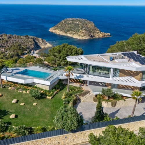 Villa with sea views for sale in Javea, located in a quiet urbanization and south oriented. On the ground floor there is a lounge, dining room and fully equipped kitchen, further there are 2 double bedrooms with en-suite bathroom. On the second floor there is a third bedroom with en-suite bathroom and terrace. Outside there is a low maintenance Mediterranean garden, a covered terrace, a sun terrace with infinity pool and jacuzzi and ample parking.