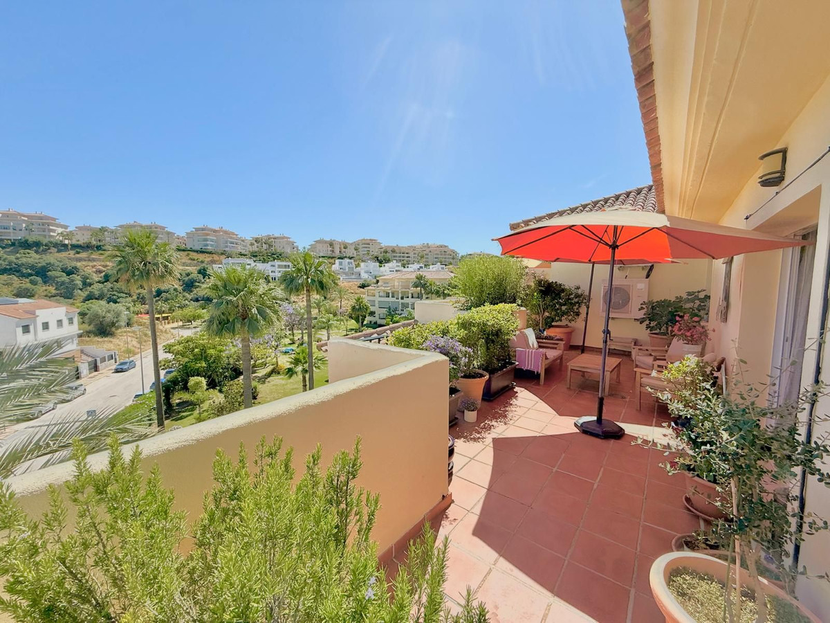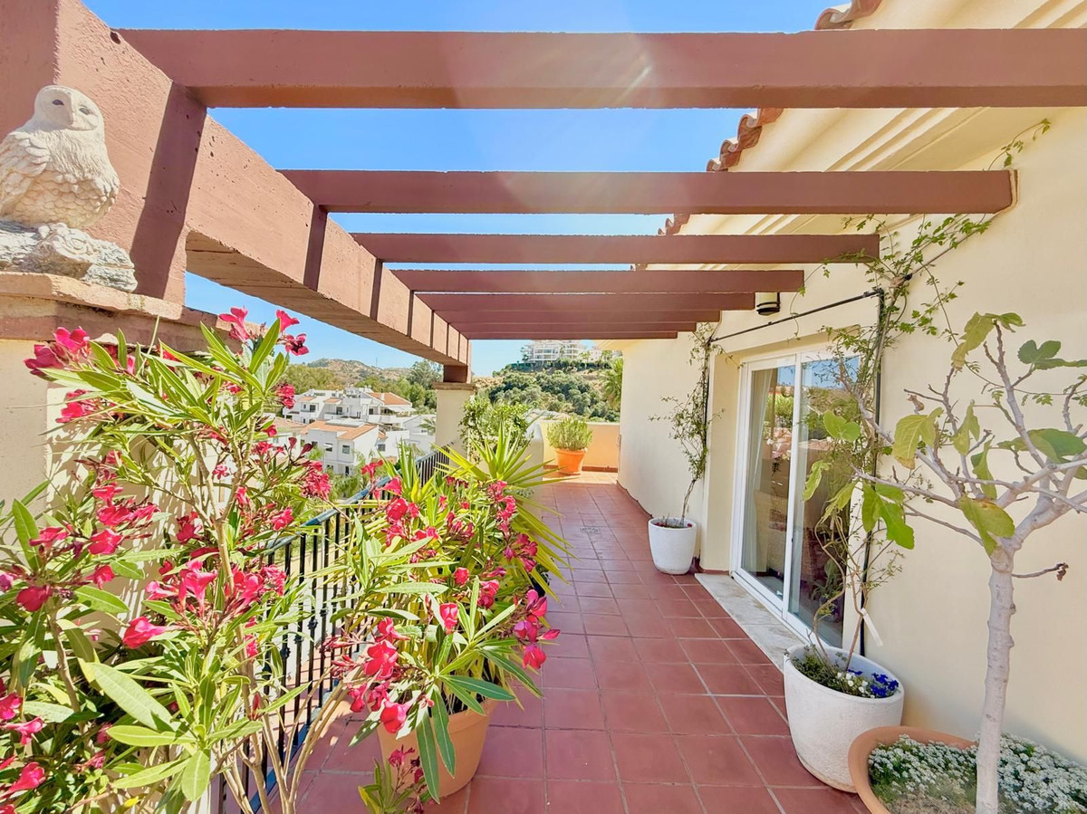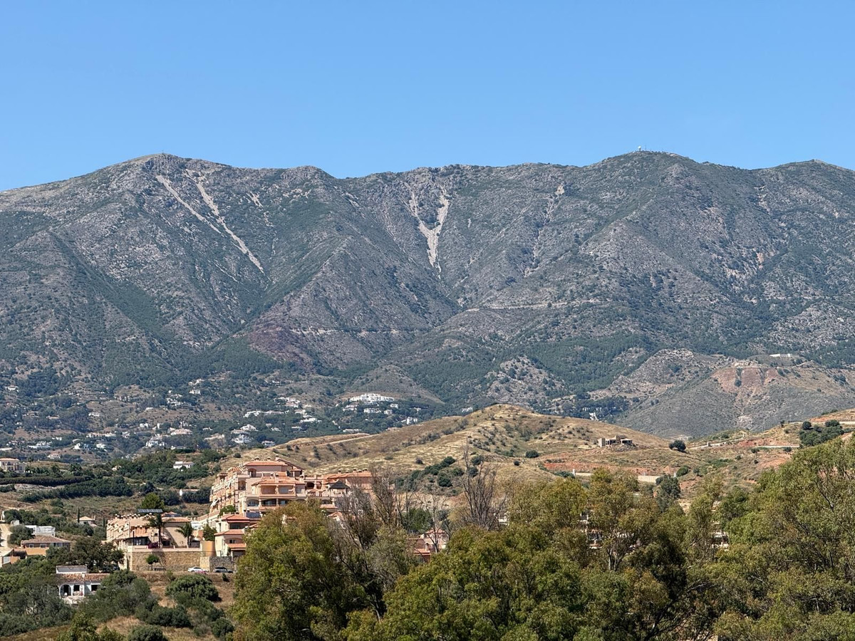 Den generösa terrassen på 104 m² vetter mot öst och bjuder på magiska soluppgångar med utsikt över Mijas stad och de omgivande bergen.