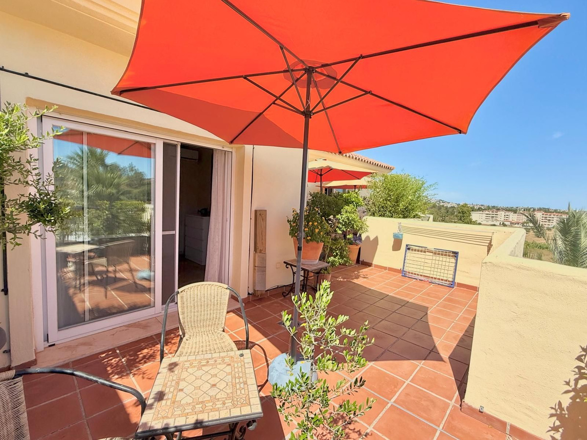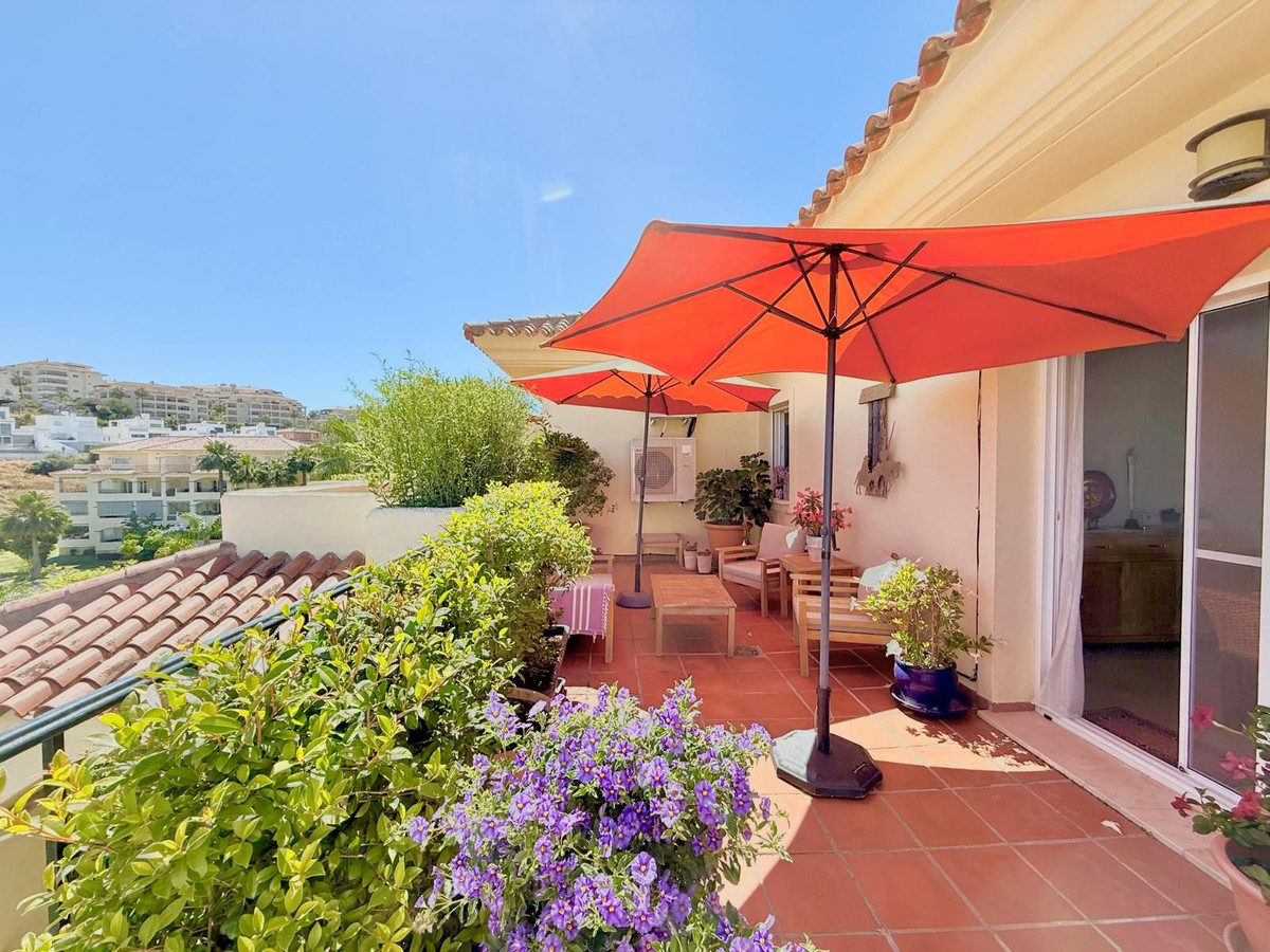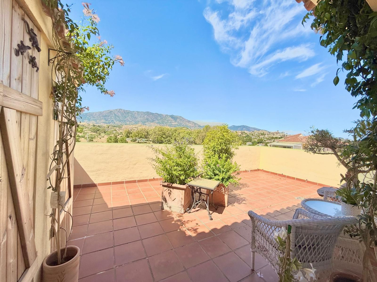 Den generösa terrassen på 104 m² vetter mot öst och bjuder på magiska soluppgångar med utsikt över Mijas stad och de omgivande bergen.