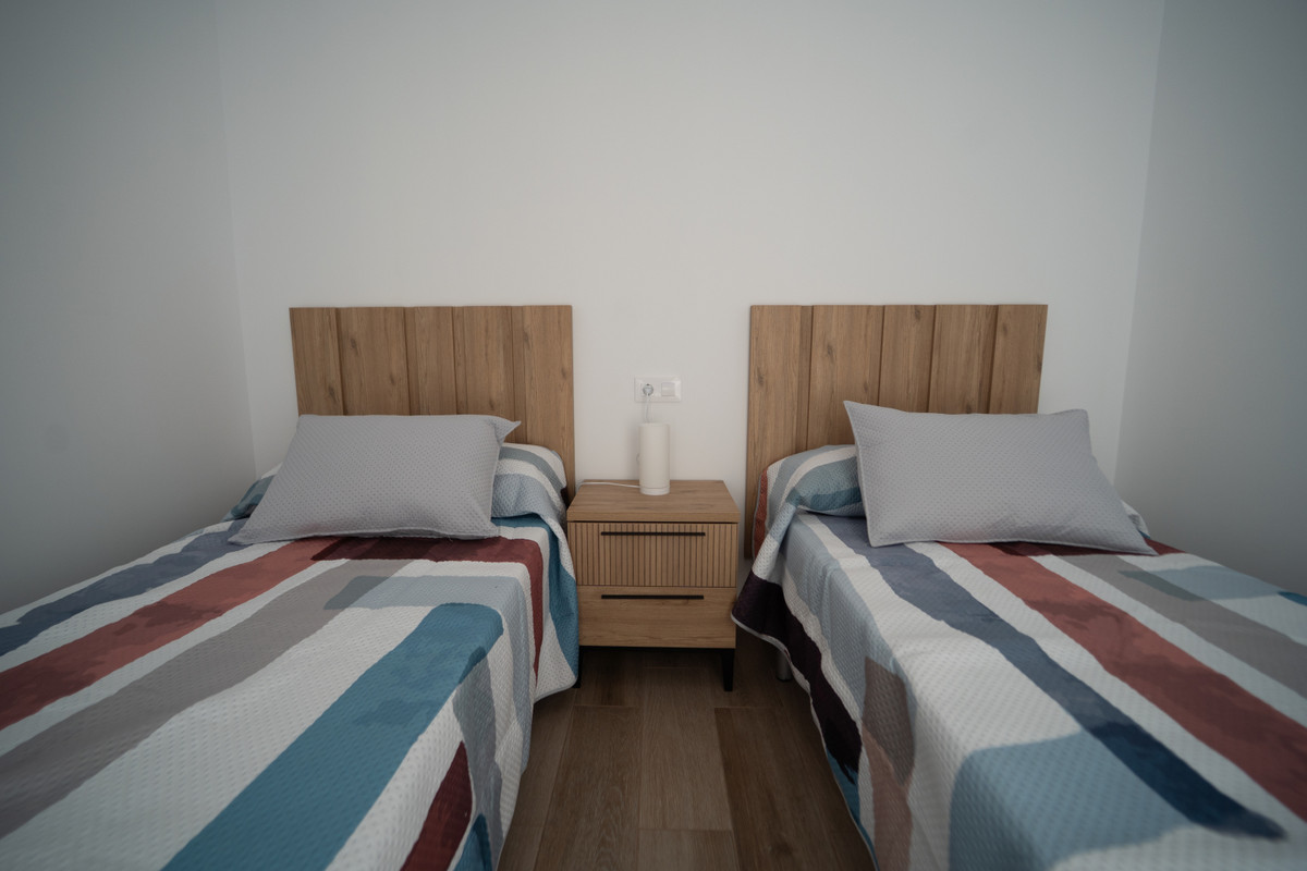 Vi erbjuder både centralt belägna och hörnlägenheter med olika orienteringar. Varje villa har 2 sovrum, 2 badrum, fullt utrustat kök med Silestone-bänkskiva och vitvaror (fläkt, spishäll, ugn, kylskåp, diskmaskin, tvättmaskin och mikrovågsugn), vardagsrum/matplats, veranda, terrass och solarium. Parkeringsplats på tomten.