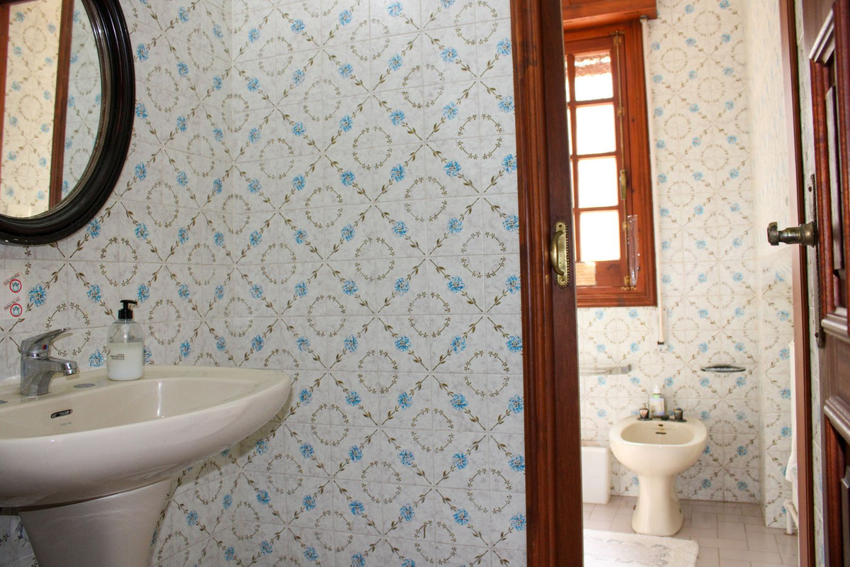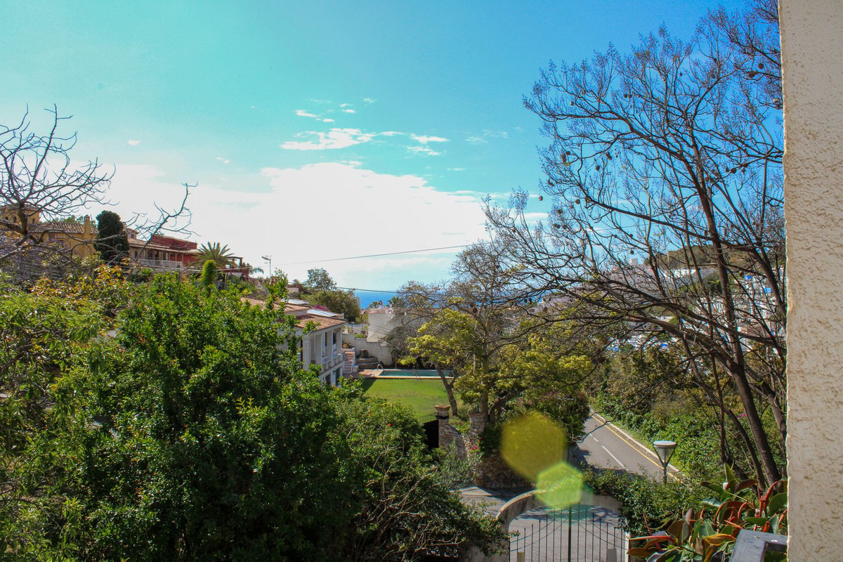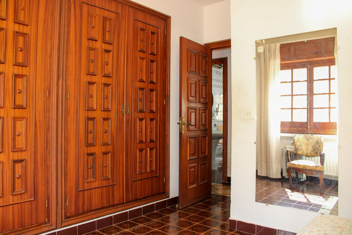 Vi går ut från entrévåningen och går uppför trappan till övre våningen. Direkt till vänster har vi ett sovrum som också används som kontor, mittemot ligger en gästtoalett. Därefter ett stort vardagsrum med öppen spis och matplats, från vardagsrummet når du en stor härlig täckt terrass med underbar utsikt över trädgården och havet. I anslutningen till matplatsen har vi ett rymligt kök och härifrån, tar vi oss ut till det stora pool-området med gott om plats för lata dagar i solstolarna. Vidare på övre våningen har vi först ett badrum, ett sovrum med eget badrum och ytterligare två sovrum.