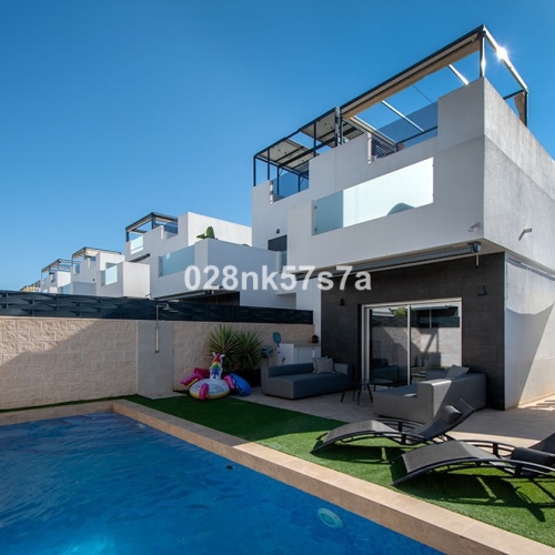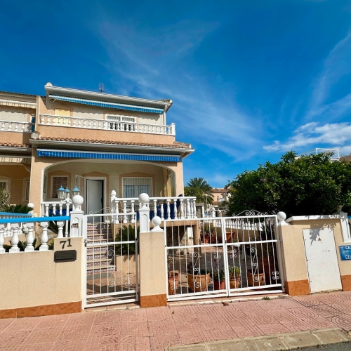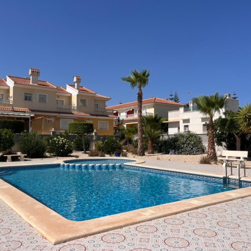 We have a beautiful 3 bedroom 2 bathroom west facing Lola style house for sale in the very popular area of Dona Pepa,  part of  Ciudad Quesada on the Costa Blanca. It is located close to many amenities including bars, restaurants, supermarkets and the long sandy beaches at Guardamar del Segura are just a 7 minute drive. The property is found inside a well established gated community and overlooks the beautiful swimming pool. The current owner has kept the home maintained to a high standard.The front of the property has a covered terrace with plenty of garden space and drive for car.