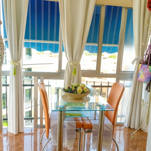 The apartment features three bedrooms, including a master suite with a private bathroom and walk-in closet, a double bedroom with large built-in wardrobes, and a room with two beds and a spacious built-in wardrobe. There are two modern bathrooms with walk-in showers, offering both comfort and functionality. The living area consists of a fully equipped open-plan kitchen connected to a bright and cozy living-dining room. This leads to a partially covered 24 m² terrace, offering pleasant views of the sea and nearby mountains. Although not fully open, the views provide a wonderful sense of space.